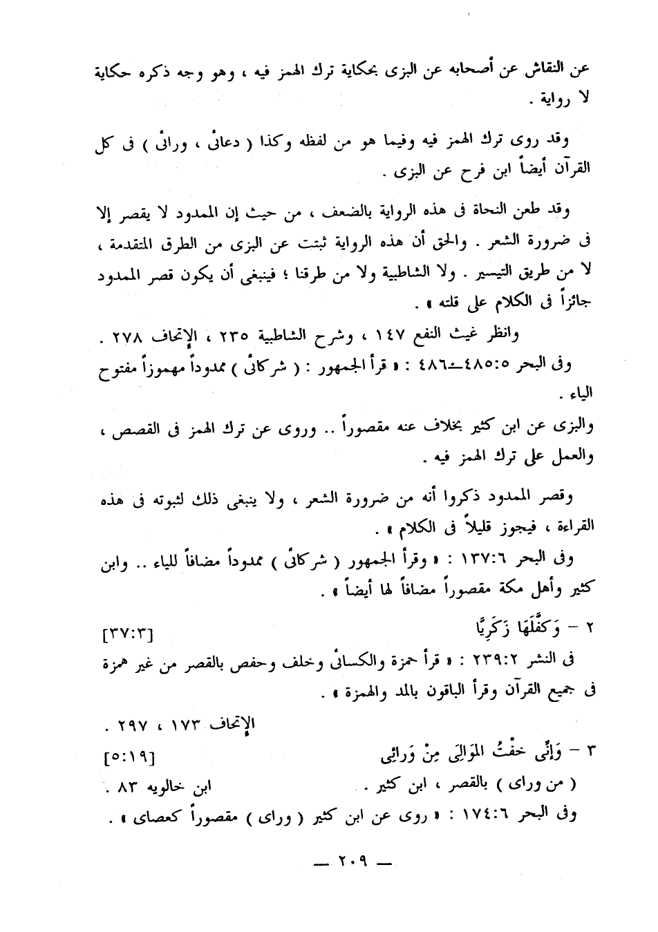 وقد طعن النحاة في هذه الرواية بالضعف، من حيث إن الممدود لا يقصر إلا في ضرورة الشعر. والحق أن هذه الرواية ثبتت عن البزي من الطرق المتقدمة، لا من طريق التيسير. ولا الشاطبية ولا من طرقنا؛ فينبغي أن يكون قصر الممدود جائزًا في الكلام على قلته».