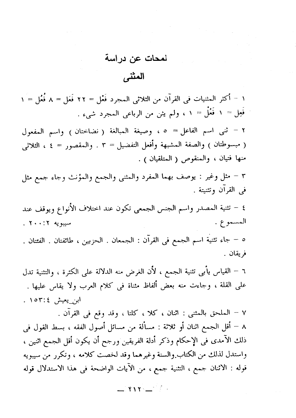 8 - أقل الجمع اثنان أو ثلاثة: مسألة من مسائل أصول الفقه، بسط القول في ذلك الآمدي في الإحكام وذكر أدلة الفريقين ورجح أن يكون أقل الجمع اثنين، واستدل لذلك من الكتاب والسنة وغيرهما وقد لخصت كلامه، وتكرر من سيبويه قوله: الاثنان جمع، التثنية جمع، من الآيات الواضحة في هذا الاستدلال قوله
