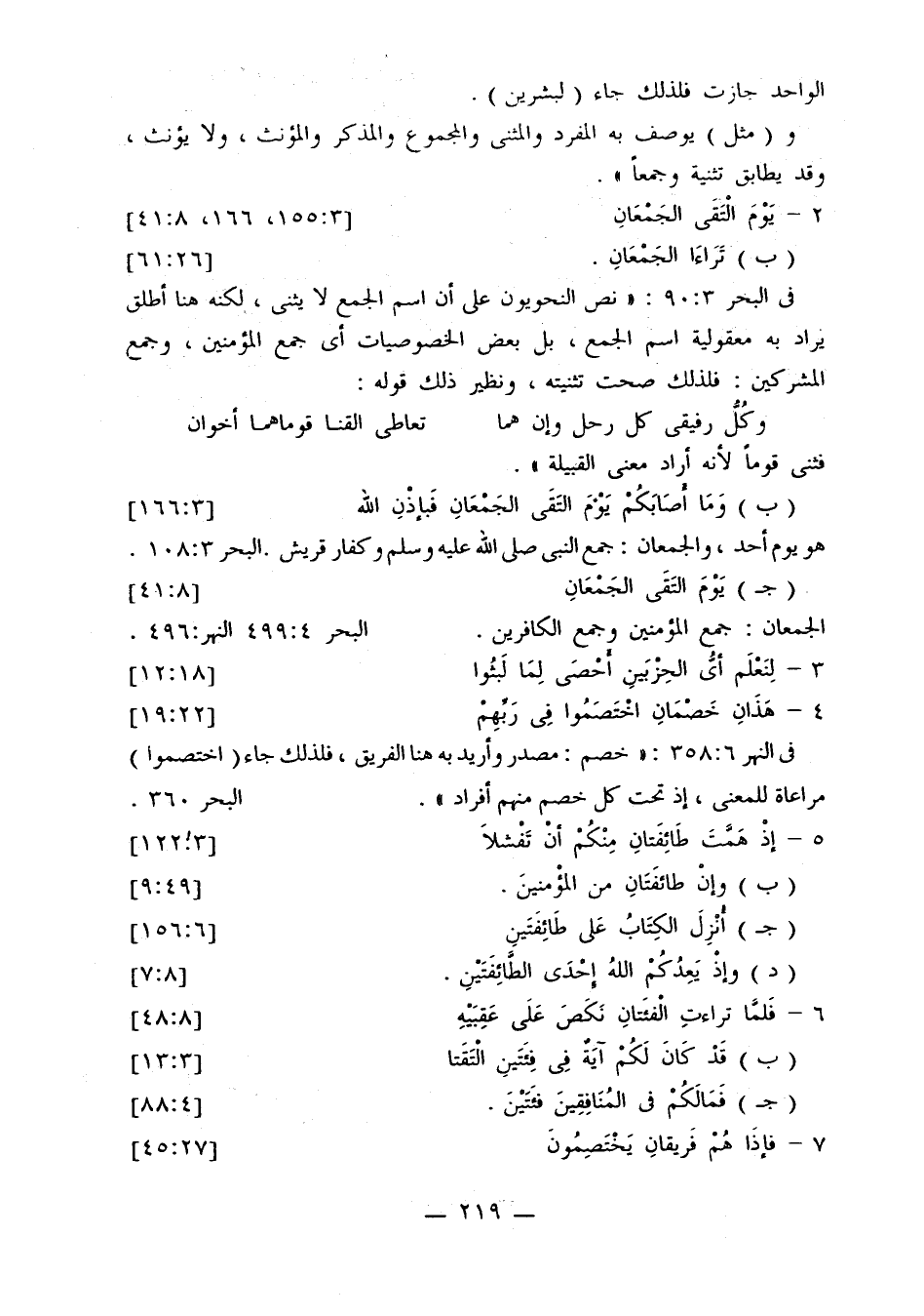 في البحر 90:3: «نص النحويون على أن اسم الجمع لا يثنى، لكنه هنا أطلق يراد به معقولية اسم الجمع، بل بعض الخصوصيات أي جمع المؤمنين، وجمع المشركين: فلذلك صحت تثنيته، ونظير ذلك قوله: