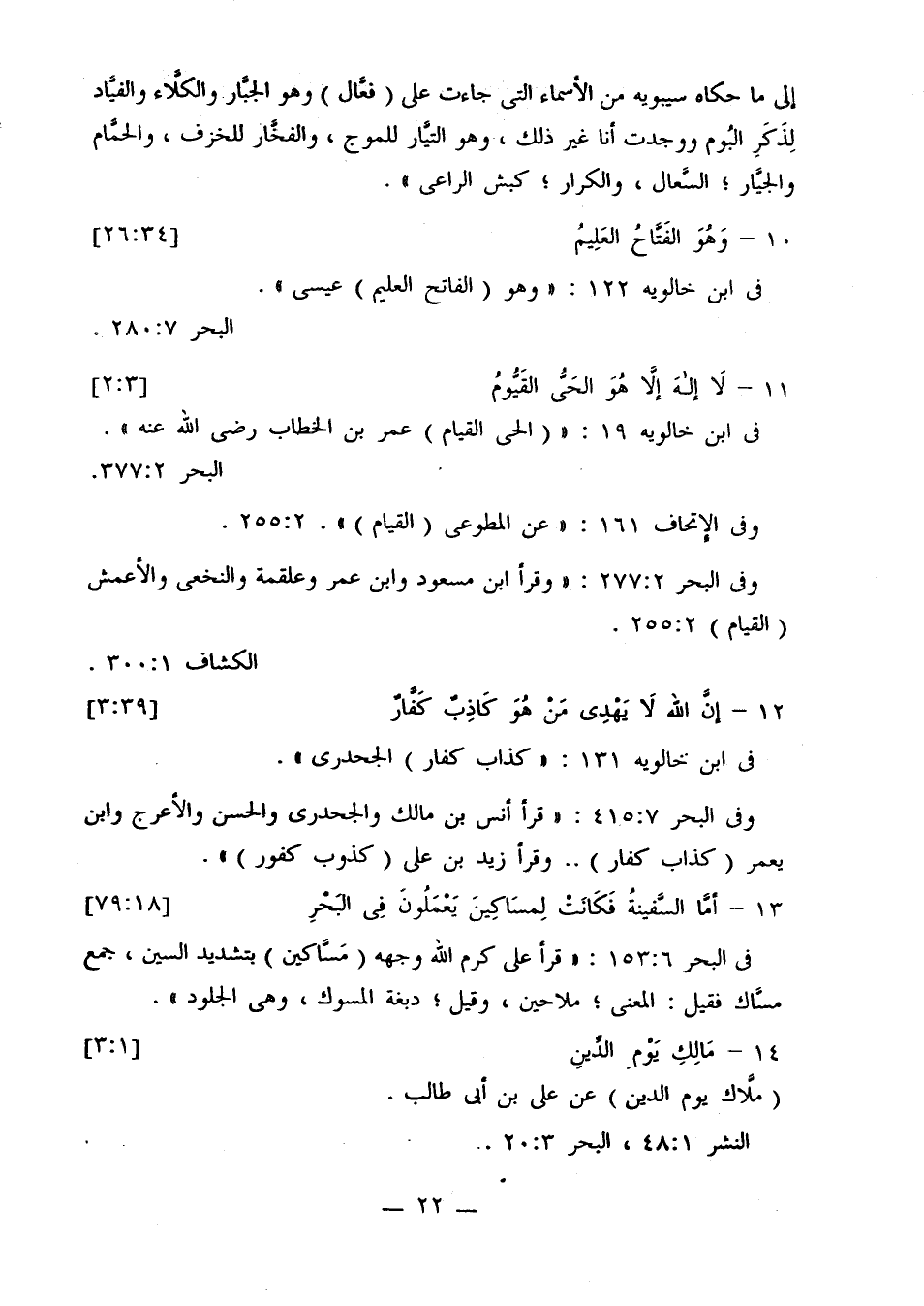 في ابن خالويه 19: «(الحي القيام) عمر بن الخطاب رضي الله عنه».