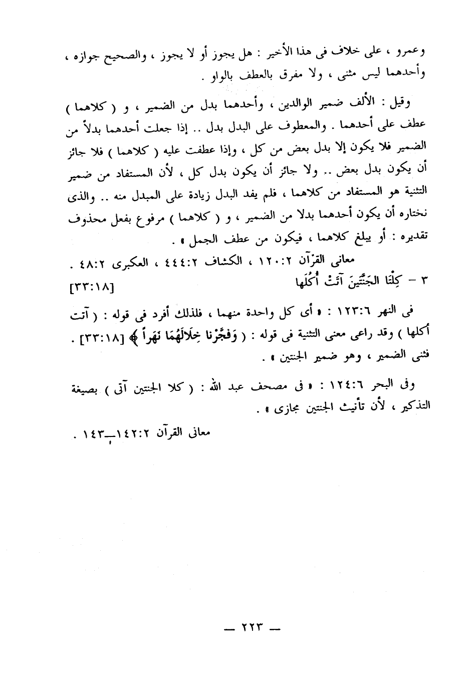 وقيل: الألف ضمير الوالدين، وأحدهما بدل من الضمير، و (كلاهما) عطف على أحدهما. والمطعوف على البدل بدل .. إذا جعلت أحدهما بدلاً من الضمير فلا يكون إلا بدل بعض من كل، وإذا عطفت عليه (كلاهما) فلا جائز أن يكون بدل بعض .. ولا جائز أن يكون بدل كل، لأن المستفاد من ضمير التثنية هو المستفاد من كلاهما، فلم يفد البدل زيادة على المبدل منه .. والذي نختاره أن يكون أحدهما بدلا من الضمير، و (كلاهما) مرفوع بفعل محذوف تقديره: أو يبلغ كلاهما، فيكون من عطف الجمل».