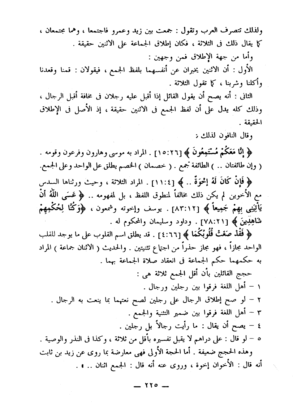{إِنَّا مَعَكُمْ مُسْتَمِعُونَ} [15:26]. المراد به موسى وهارون وفرعون وقومه. (وإن طائفتان ..) الطائفة جمع. (خصمان) الخصم يطلق على الواحد وعلى الجمع. {فَإِنْ كَانَ لَهُ إِخْوَةٌ ..} [11:4]. المراد الثلاثة، وحيث ورثناها السدس مع الأخوين لم يكن ذلك مخالفًا لمنطوق اللفظ، بل لمفهومة .. {عَسَى اللَّهُ أَنْ يَأْتِيَنِي بِهِمْ جَمِيعًا} [83:12]. يوسف وإخوته وشمعون، {وَكُنَّا لِحُكْمِهِمْ شَاهِدِينَ} [78:21]. وداود وسليمان والمحكوم له.