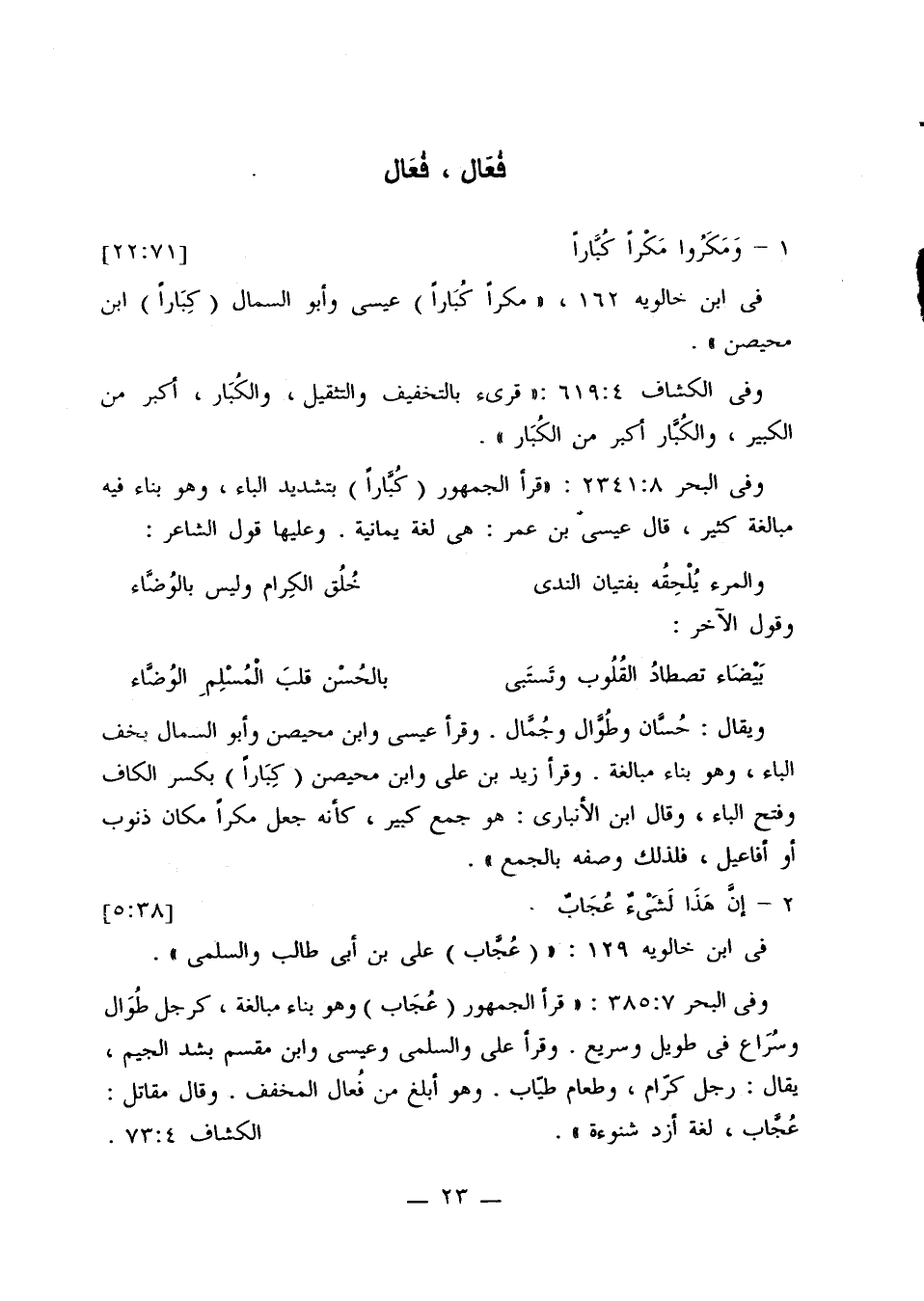 وفي البحر 385:7: «قرأ الجمهور (عجاب) وهو بناء مبالغة، كرجل طوال وسراع في طويل وسريع. وقرأ علي والسلمي وعيسى وابن مقسم بشد الجيم، يقال: رجل كرام، وطعام طياب. وهو أبلغ من فعال المخفف. وقال مقاتل: عجاب، لغة أزد شنوءة». الكشاف 73:4.