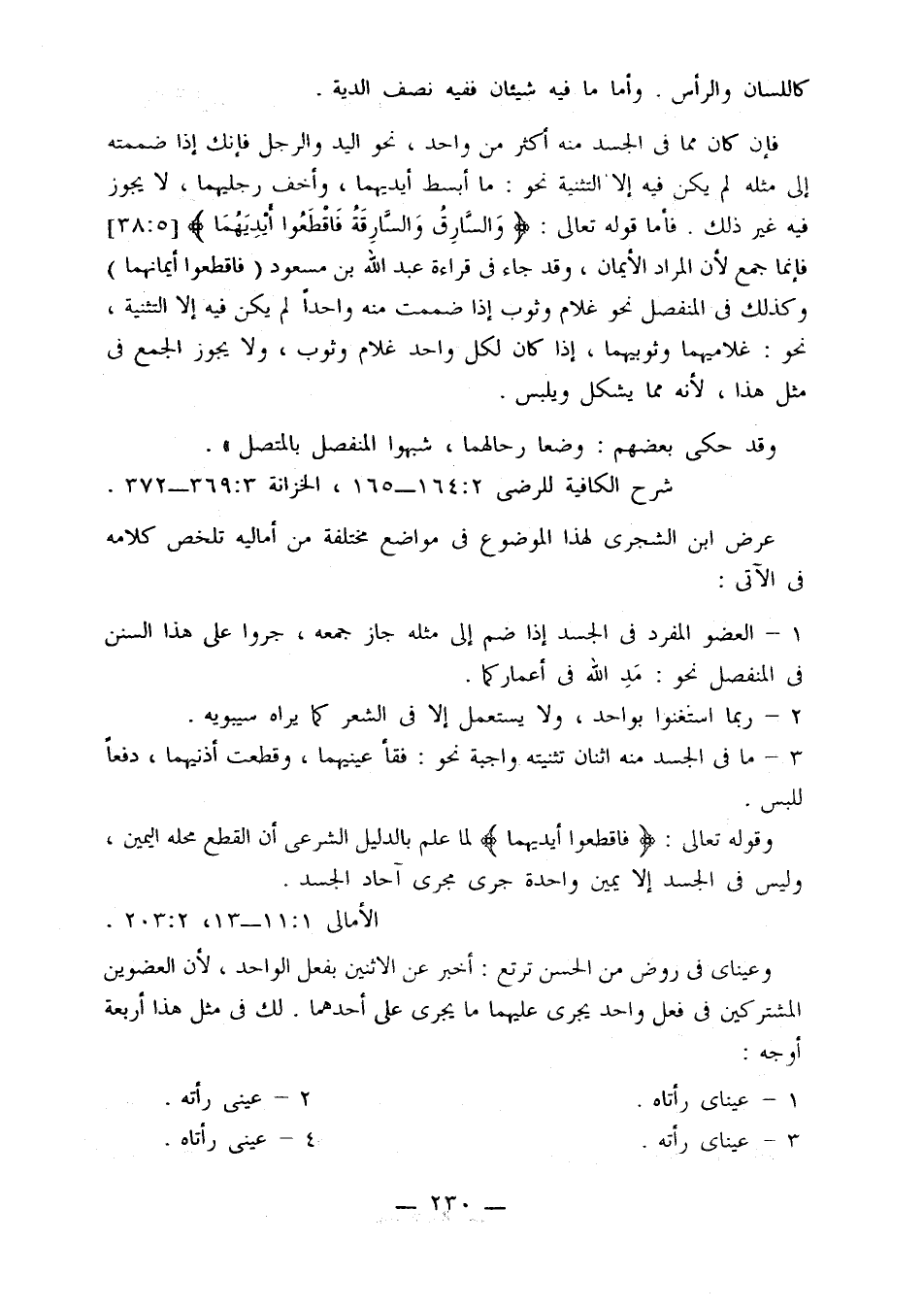 فإن كان مما في الجسد منه أكثر من واحد، نحو اليد والرجل فإنك إذا ضممته إلى مثله لم يكن فيه إلا التثنية نحو: ما أبسط أيديهما، وأخف رجليهما، لا يجوز فيه غير ذلك. فأما قوله تعالى: السَّارِقُ وَالسَّارِقَةُ فَاقْطَعُوا أَيْدِيَهُمَا {38:5} فإنما جمع لأن المراد الأيمان، وقد جاء في قراءة عبد الله بن مسعود (فاقطعوا أيمانهما) وكذلك في المنفصل نحو غلام وثوب إذا ضممت منه واحدًا لم يكن فيه إلا التثنية، نحو: غلاميهما وثوبيهما، إذا كان لكل واحد غلام وثوب، ولا يجوز الجمع في مثل هذا، لأنه مما يشكل ويلبس.