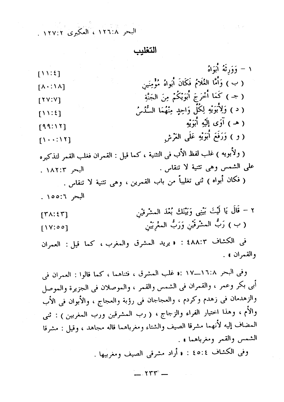 وفي البحر 16:8 - 17: «غلب المشرق، فثناهما، كما قالوا: العمران في أبي بكر وعمر، والقمران في الشمس والقمر، والموصلان في الجزيرة والموصل والزهدمان في زهدم وكردم، والعجاجان في رؤبة والعجاج، والأبوان في الأب والأم، وهذا اختيار الفراء والزجاج، (رب المشرقين ورب المغربين): ثنى المضاف إليه لأنهما مشرقًا الصيف والشتاء ومغرباهما قاله مجاهد، وقيل: مشرقًا الشمس والقمر ومغرباهما».