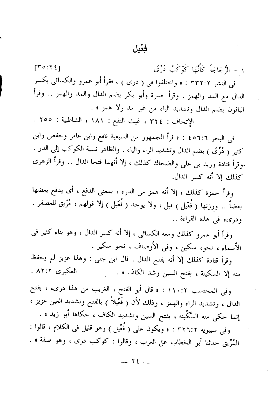 في البحر 456:6: «قرأ الجمهور من السبعية نافع وابن عامر وحفص وابن كثير (دري) بضم الدال وتشديد الراء والياء. والظاهر نسبة الكوكب إلى الدر. وقرأ قتادة وزيد بن علي والضحاك كذلك، إلا أنهما فتحا الدال .. وقرأ الزهري كذلك إلا أنه كسر الدال.