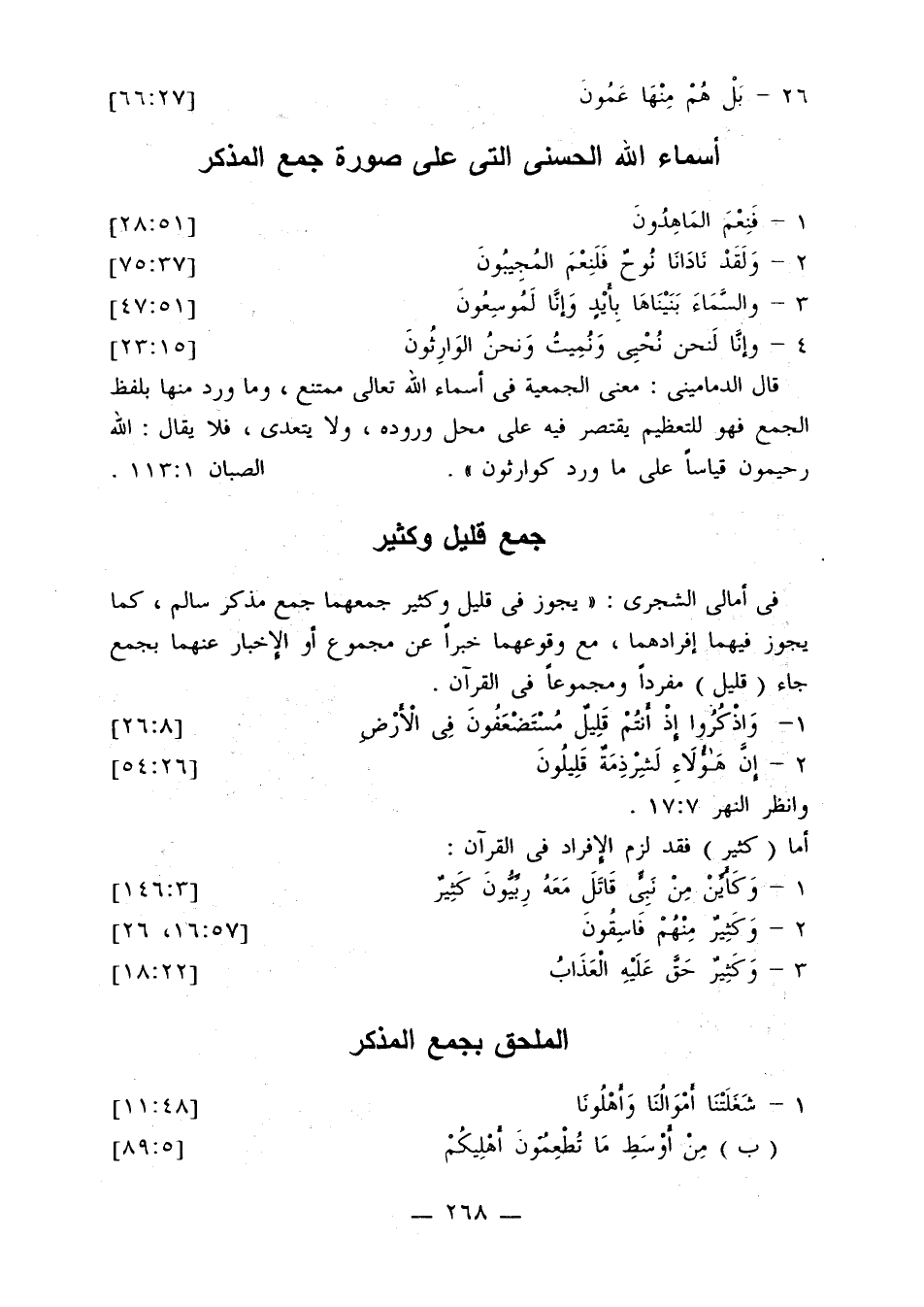 في أمالي الشجري: «يجوز في قليل وكثير جمعها جمع مذكر سالم، كما يجوز فيهما إفرادهما، مع وقوعهما خبرًا عن مجموع أو الإخبار عنهما بجمع جاء (قليل) مفردًا ومجموعًا في القرآن».
