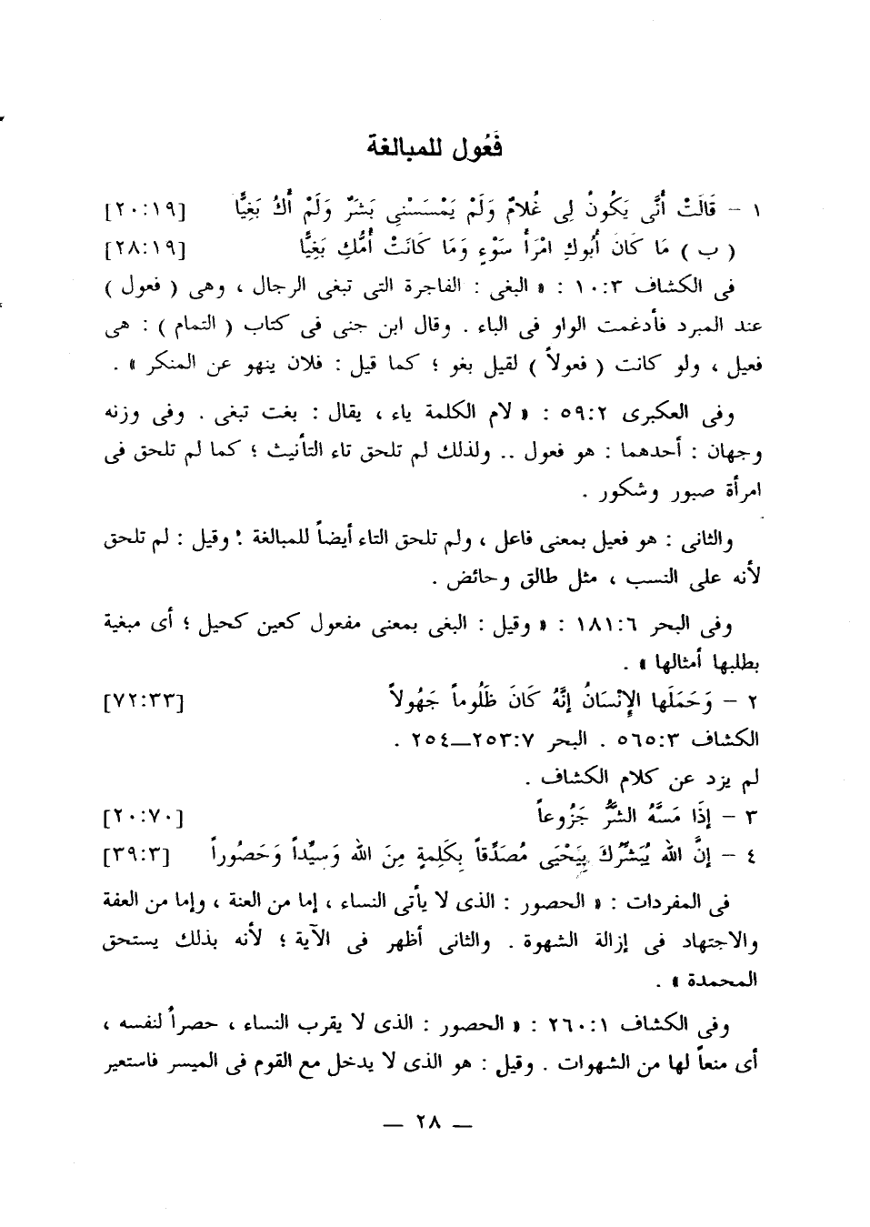 في الكشاف 10:3: «البغي: الفاجرة التي تبغي الرجال، وهي (فعول) عند المبرد فأدغمت الواو في الباء. وقال ابن جني في كتاب (التمام): هي فعيل، ولو كانت (فعولاً) لقيل بغو؛ كما قيل: فلان ينهو عن المنكر».
