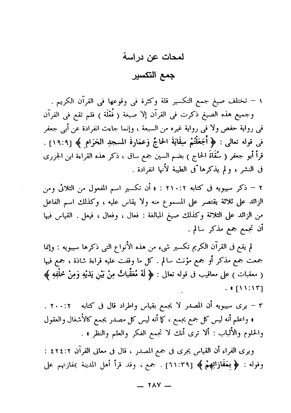 لم يقع في القرآن الكريم تكسير شيء من هذه الأنواع التي ذكرها سيبويه: وإنما جمعت جمع مذكر أو جمع مؤنث سالم. كل ما وقفت عليه قراءة شاذة، جمع فيها (معقبات) على معاقيب في قوله تعالى: {له معقبات من بين يديه ومن خلفه} [13: 11]».