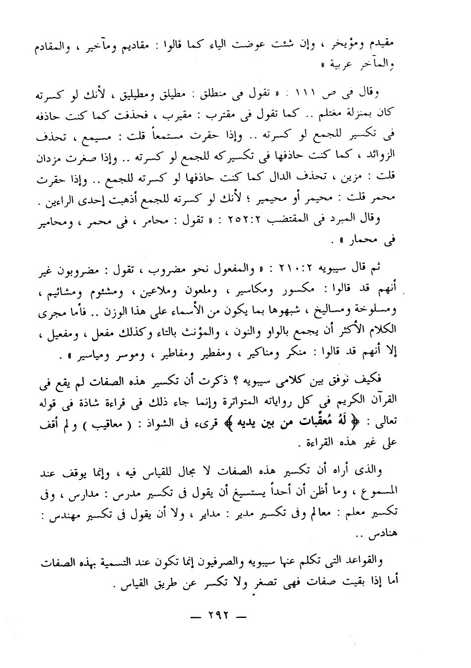 فكيف نوفق بين كلامي سيبويه؟ ذكرت أن تكسير هذه الصفات لم يقع في القرآن الكريم في كل رواياته المتواترة وإنما جاء ذلك في قراءة شاذة في قوله تعالى: {له معقبات من بين يديه} قرئ في الشواذ: (معاقيب) ولم أقف على غير هذه القراءة.