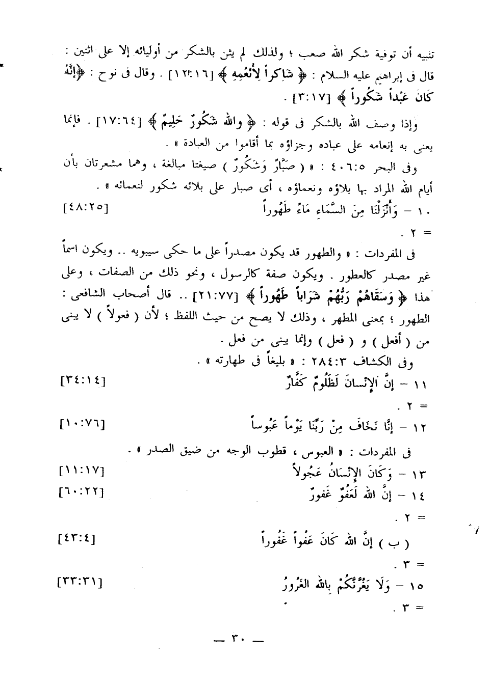تنبيه أن توفية شكر الله صعب؛ ولذلك لم يئن بالشكر من أوليائه إلا على اثنين: قال في إبراهيم عليه السلام: {شاكرًا لأنعمه} [12:16]. وقال في نوح: {إنه كان عبدًا شكورًا} [3:17].
