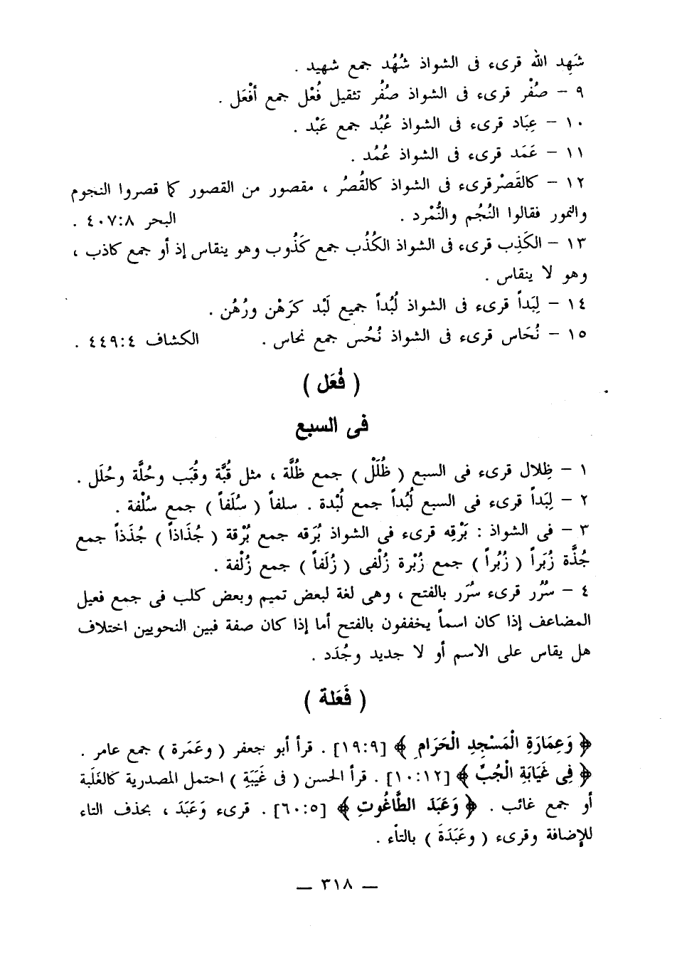 3 - في الشواذ: برقه قرئ في الشواذ برقه جمع برقة (جذاذًا) جذذًا جمع جذة زبرًا (زبرًا) جمع زبرة زلفى (زلفًا) جمع زلفة.