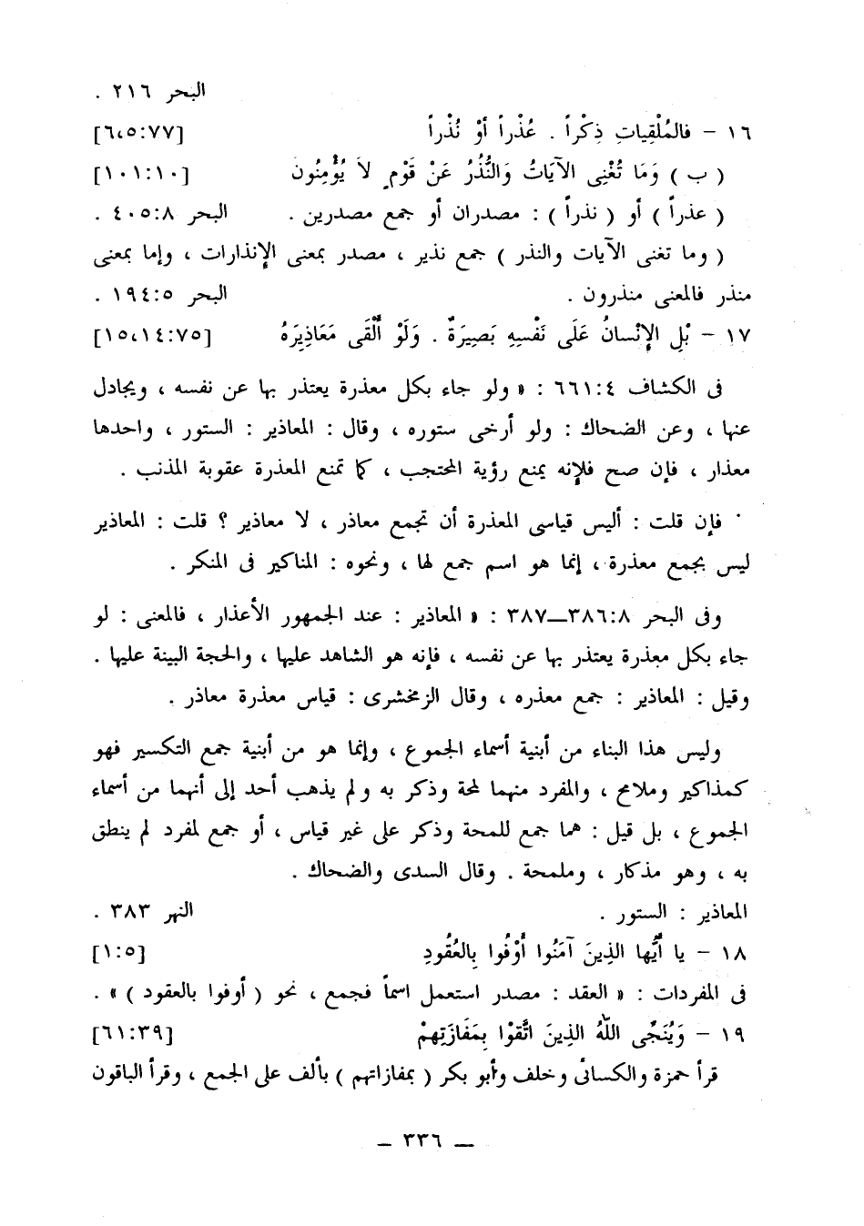 وفي البحر 8: 386 - 387: «المعاذير: عند الجمهور الأعذار، فالمعنى: لو جاء بكل معذرة يعتذر بها عن نفسه، فإنه هو الشاهد عليها، والحجة البنية عليها. وقيل: المعاذير: جمع معذره، وقال الزمخشري: قياس معذرة معاذر».