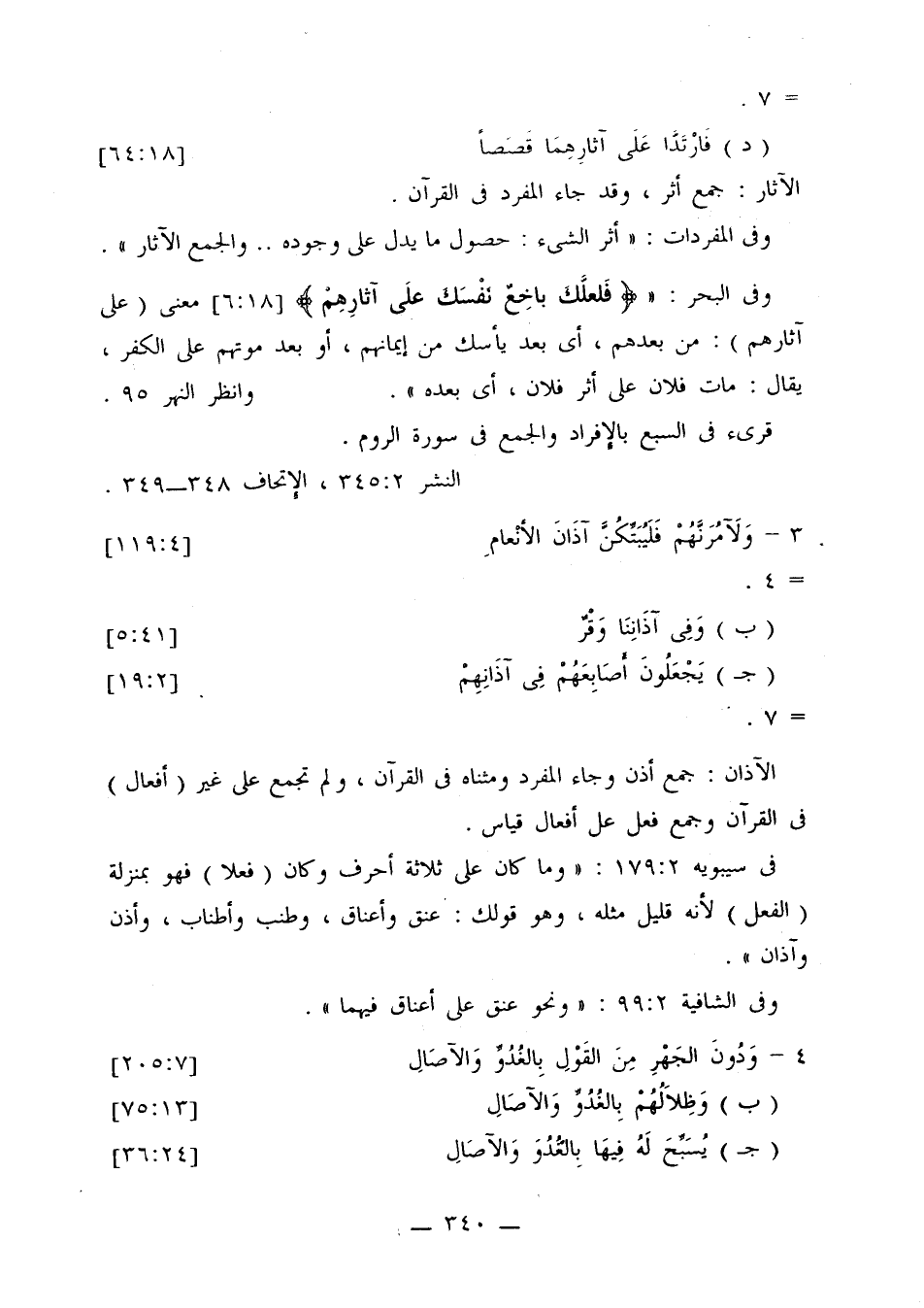 الآذان: جمع أذن وجاء المفرد ومثناه في القرآن، ولم تجمع على غير (أفعال) في القرآن وجمع فعل على أفعال قياس.
