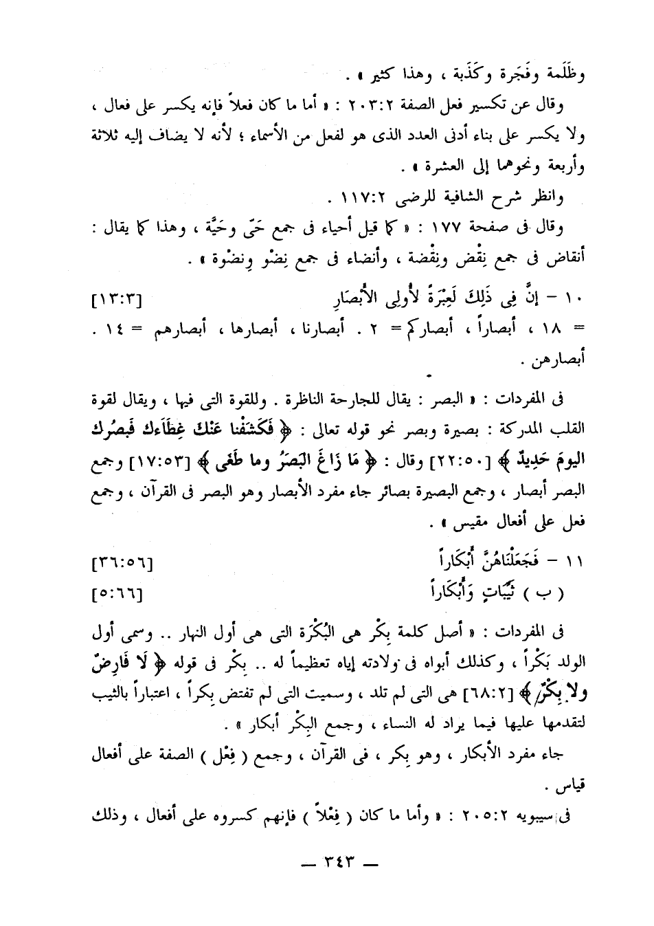 وقال عن تكسير فعل الصفة 2: 303: «أما ما كان فعلا فإنه يكسر على فعال، ولا يكسر على بناء أدنى العدد الذي هو لفعل من الأسماء؛ لأنه لا يضاف إليه ثلاثة وأربعة ونحوهما إلى العشرة».
