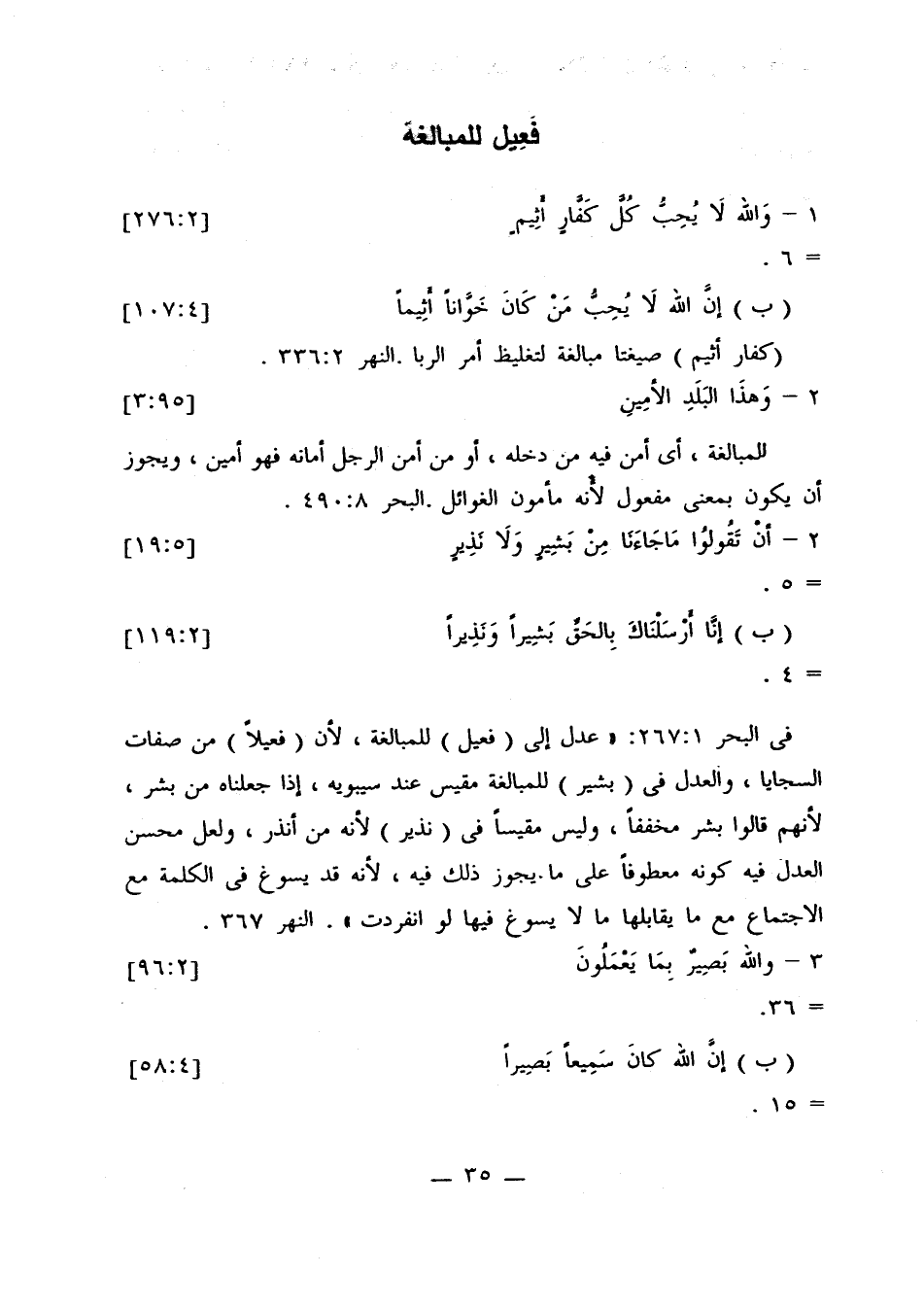 في البحر 267: «عدل إلى (فعيل) للمبالغة، لأن (فعيلاً) من صفات السجايا، والعدل في (بشير) للمبالغة مقيس عند سيبويه، إذا جلعناه من بشر، لأنهم قالوا بشر مخففًا، وليس مقيسًا في (نذير) لأنه من أنذر، ولعل محسن العدل فيه كونه معطوفًا على ما يجوز ذلك فيه، لأنه قد يسوغ في الكلمة مع الاجتماع مع ما يقابلها ما لا يسوغ فيها لو انفردت». النهر 367.
