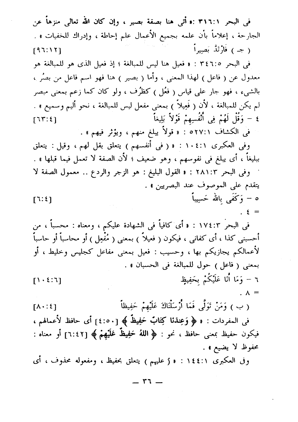 في البحر 346:5: «فعيل هنا ليس للمبالغة؛ إذ فعيل الذي هو للمبالغة هو معدول عن (فاعل) لهذا المعنى، وأما (بصير) هنا فهو اسم فاعل من بصر، بالشيء، فهو جار على قياس (فعل) كظرف، ولو كان كما زعم بمعنى مبصر لم يكن للمبالغة، لأن (فعيلاً) بمعنى مفعل ليس للمبالغة، نحو أليم وسميع».