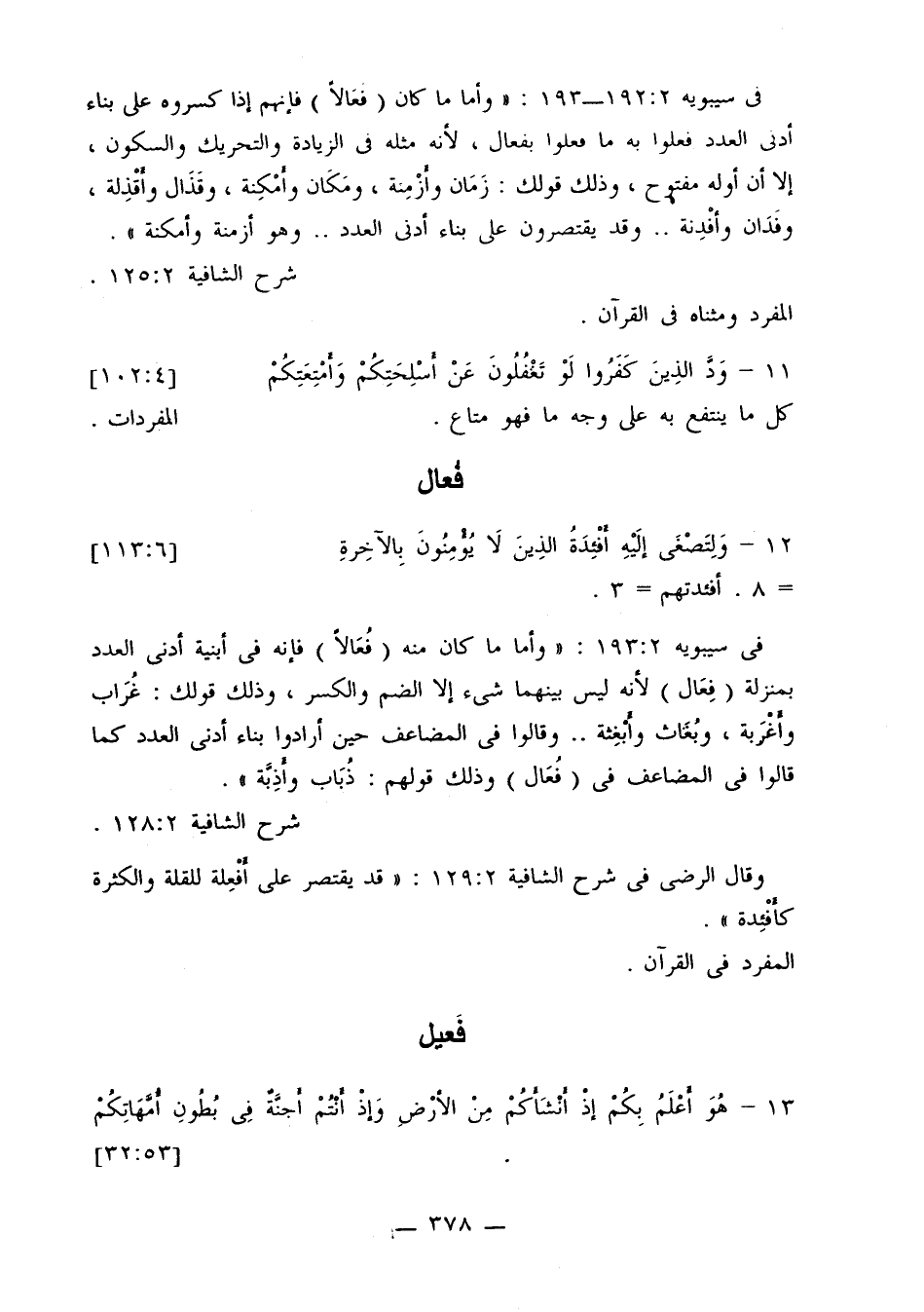 في سيبويه 2: 193: «وأما ما كان منه (فعالا) فإنه في أبنية أدنى العدد بمنزلة (فعال) لأنه ليس بينهما شيء إلا الضم والكسر، وذلك قولك: غراب وأغربه، وبغاث وأبغثه ... وقالوا في المضاعف حين أرادوا بناء أدنى العدد كما قالوا في المضاعف في (فعال) وذلك قولهم: ذباب وأذبة».