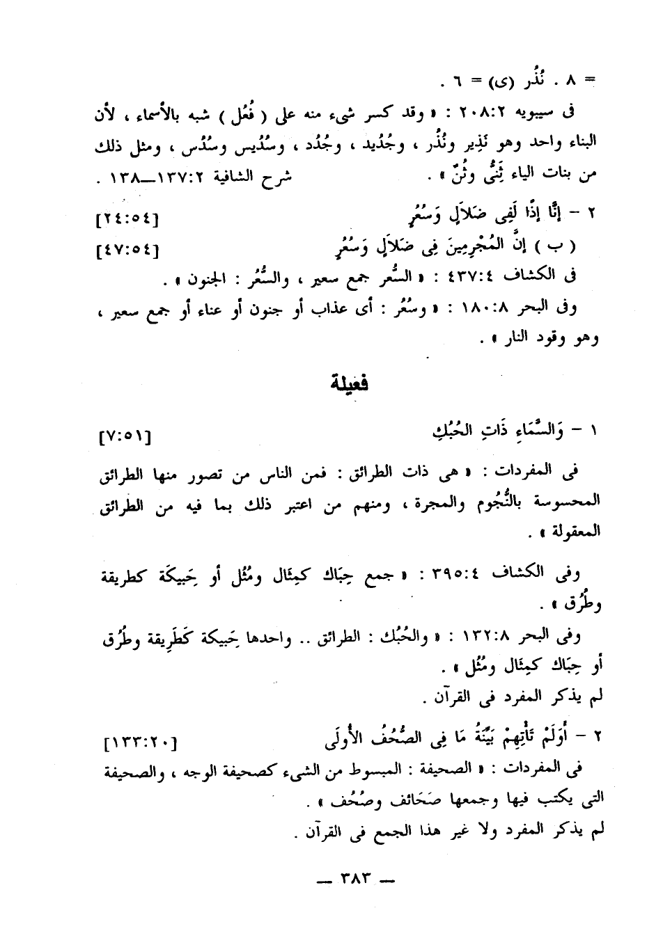 في سيبويه 2: 208: «وقد كسر شيء منه على (فُعُل) شبه بالأسماء، لأن البناء واحد وهو نذير ونذر، وجديد، وجدد، وسديس وسدس، ومثل ذلك من بنات الياء ثنى وثن».
