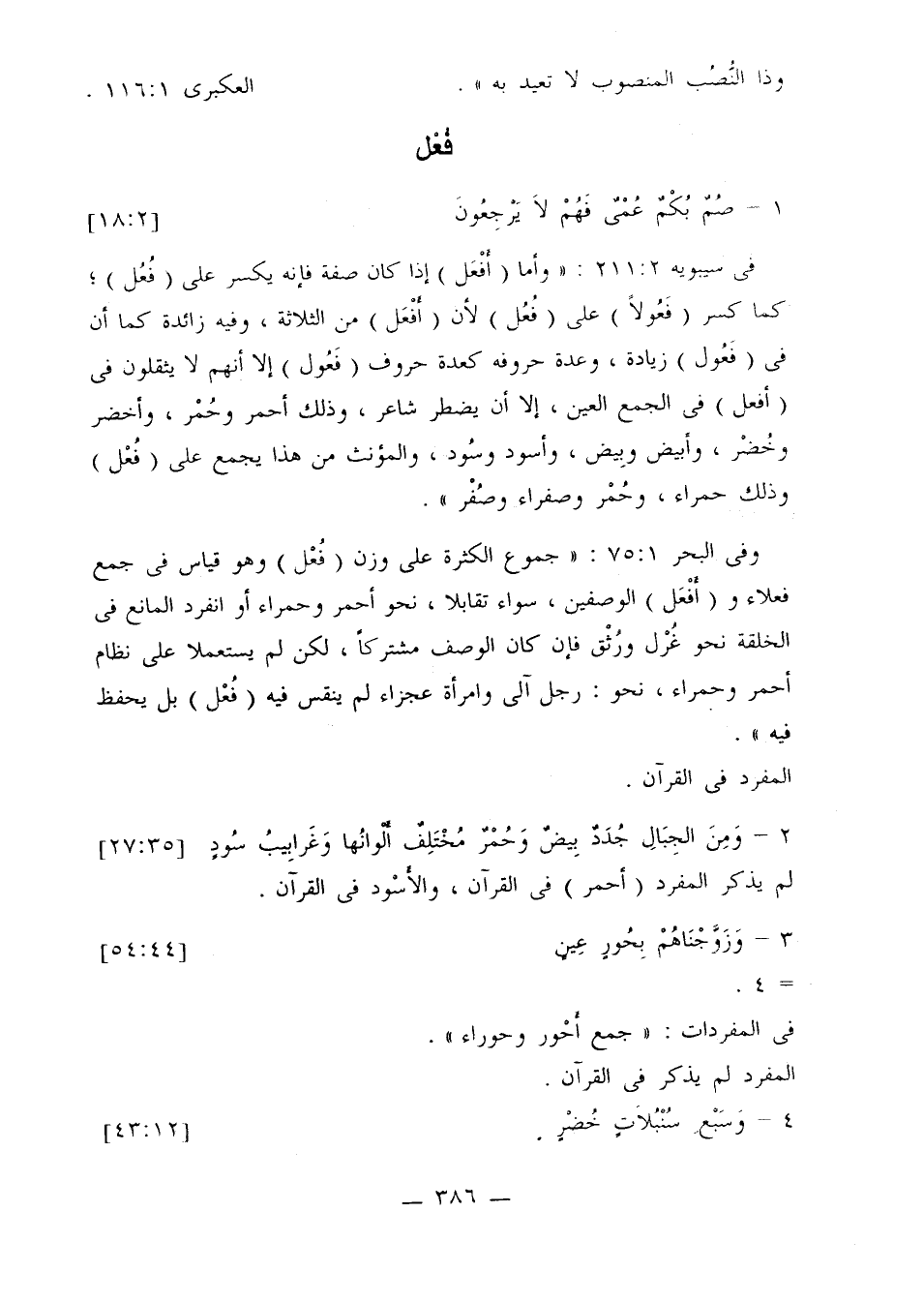 في سيبويه 2: 211: «وأما (أفعل) إذا كان صفة فإنه يكسر على (فعل)؛ كما كسر (فعولا) على (فعل) لأن (أفعل) من الثلاثة، وفيه زائدة كما أن في (فعول) زيادة، وعدة حروفه كعدة حروف (فعول) إلا أنهم لا يثقلون في (أفعل) في الجمع العين، إلا أن يضطر شاعر، وذلك أ؛ مر وحمر، وأخضر وخضر، وأبيض وبيض، وأسود وسود، والمؤنث من هذا يجمع على (فعل) وذلك حمراء، وحمر وصفراء وصفر».