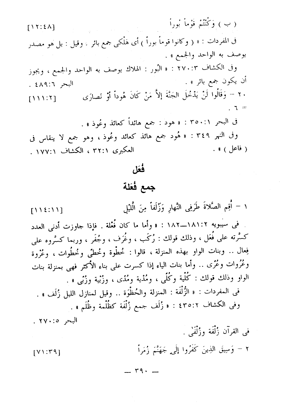 في سيبويه 2: 181 - 182: «وأما ما كان فُعلة. فإذا جاوزت أدنى العدد كسرته على فعل، وذلك قولك: ركب، وغرف، وجفر، وربما كسروه على فعال ... وبنات الواو بهذه المنزلة، قالوا: خطوة وخطى وخطوات، وعروة وعروات وعرى ... وأما بنات الياء إذا كسرت على بناء الأكثر فهي بمنزلة بنات الواو وذلك قولك: كلية وكلى، ومدية مدى، وزبية وزبى».