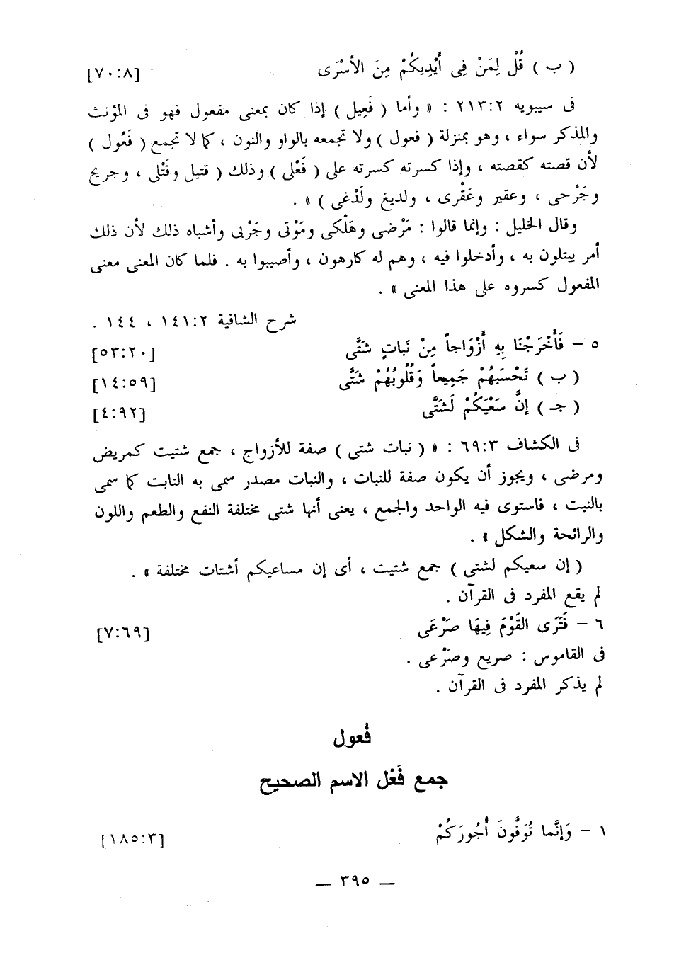 وقال الخليل: «وإنما قالوا: مرضى وهلكى وموتى وجربى وأشباه ذلك لن ذلك أمر يبتلون به، وأدخلوا فيه، وهم له كارهون، وأصيبوا به. فلما كان المعنى معنى المفعول كسروه على هذا المعنى».