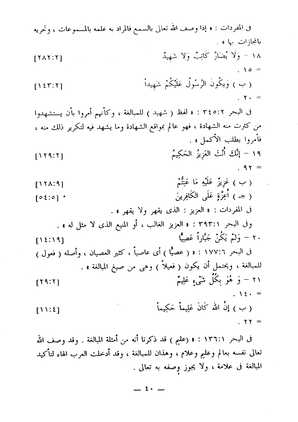 في البحر 136:1: «(عليم) قد ذكرنا أنه من أمثلة المبالغة. وقد وصف الله تعالى نفسه بعالم وعليم وعلام، وهذان للمبالغة، وقد أدخلت العرب الهاء لتأكيد المبالغة في علامة، ولا يجوز وصفه به تعالى.