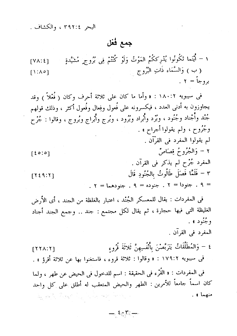 في سيبويه 2: 180: «وأما ما كان على ثلاثة أحرف وكان (فعلا) وقد يجاوزون به أدنى العدد، فيكسرونه على فعول وفعال وفعول أكثر، وذلك قولهم جند وأجناد وجنود، وبرد وأبراد وبرود، وبرج وأبراج وبروج، وقالوا: جرح وجرح، ولم يقولوا أجراح».