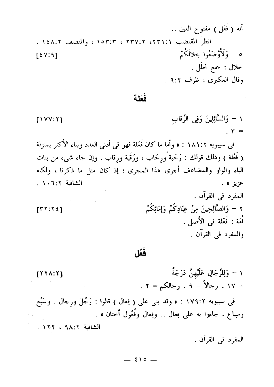 في سيبويه 2: 181: «وأما ما كان فعلة فهو في أدنى العدد وبناء الأكثر بمنزلة (فَعْلة) وذلك قولك: رحبة ورحاب، ورقبة ورقاب. وإن جاء شيء من بنات الياء والواو والمضاعف أجرى هذا المجرى؛ إذ كان مثل ما ذكرنا، ولكنه عزيز».