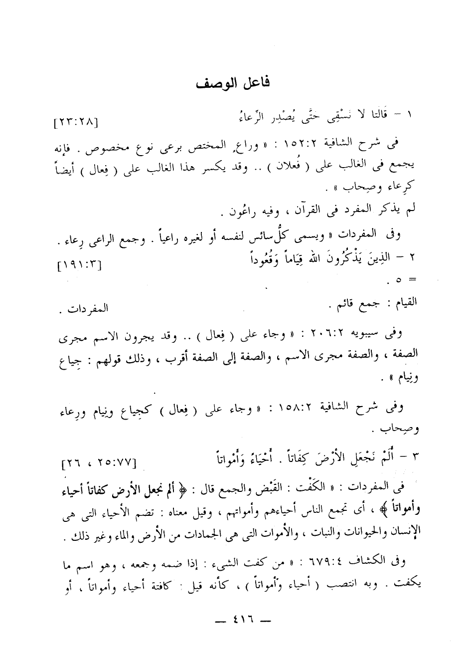 في شرح الشافية 2: 152: «وراع المختص برعى نوع مخصوص. فإنه يجمع في الغالب على (فُعلان) ... وقد يكسر هذا الغالب على (فِعال) أيضًا كرعاء وصحاب».
