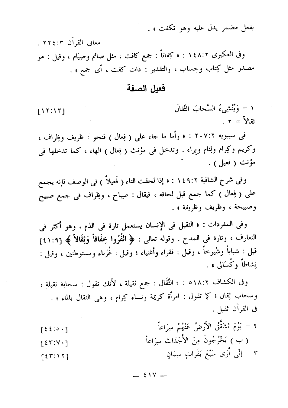 وفي الكشاف 2: 518: «الثقال: جمع ثقيلة، لأنك تقول: سحابة ثقيلة، وسحاب ثقال؛ كما تقول: امرأة كريمة ونساء كرام، وهي الثقال بالماء».