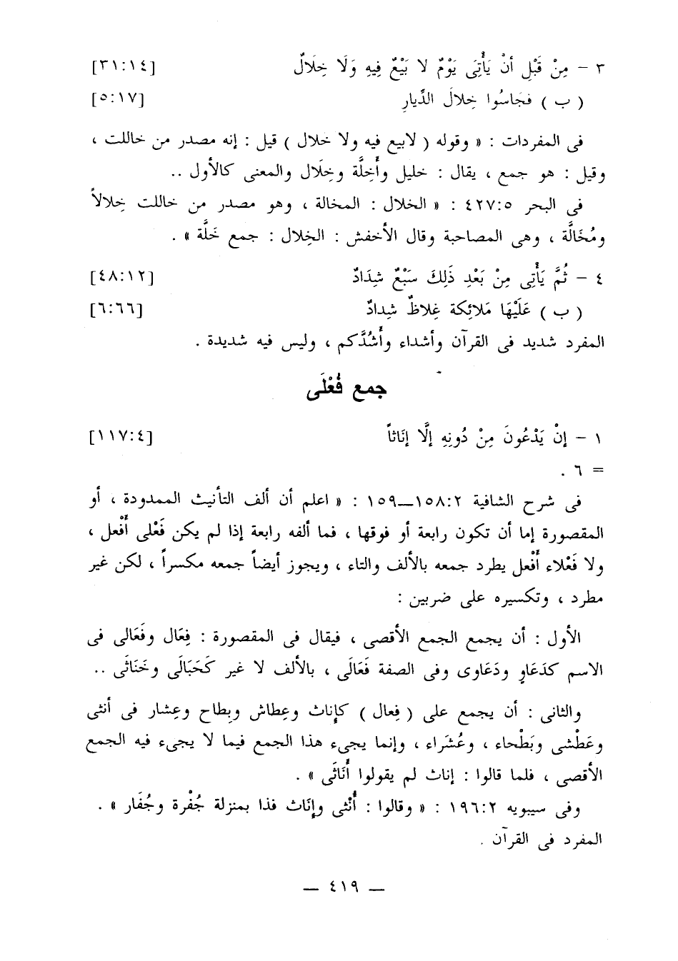 في المفردات: «وقوله (لا بيع فيه ولا خلال) قيل: إنه مصدر من خالت، وقيل: هو جمع، يقال: خليل وأخلة وخلال والمعنى كالأول ...».