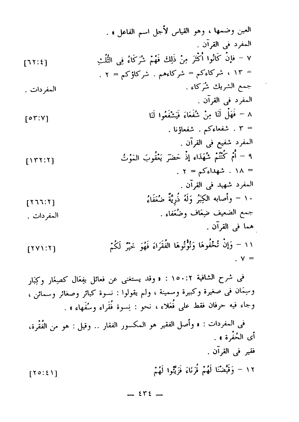 في شرح الشافية 2: 150: «وقد يستغنى عن فعائل بفعال كصغار وكبار وسيمان في صغيرة وكبيرة وسمينة، ولم يقولوا: نسوة كبائر وصغائر وسمائن، وجاء فيه حرفان فقط على فعلاء، نحو: نسوة فقراء وسفهاء».