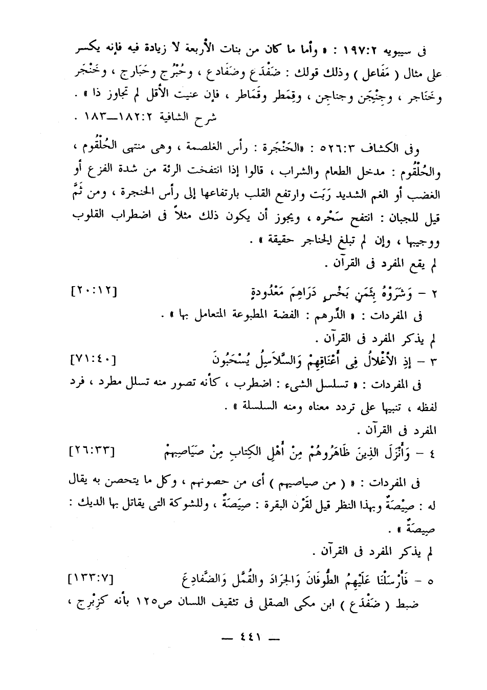 في سيبويه 2: 197: «وأما ما كان من بنات الأربعة لا زيادة فيه فإنه يكسر على مثال (مفاعل) وذلك قولك: ضفدع وضفادع، وحبرج وحبارج، وخنجر وخناجر، وجنجن وجناجن، وقمطر وقماطر، فإن عنيت الأقل لم تجاور ذا».