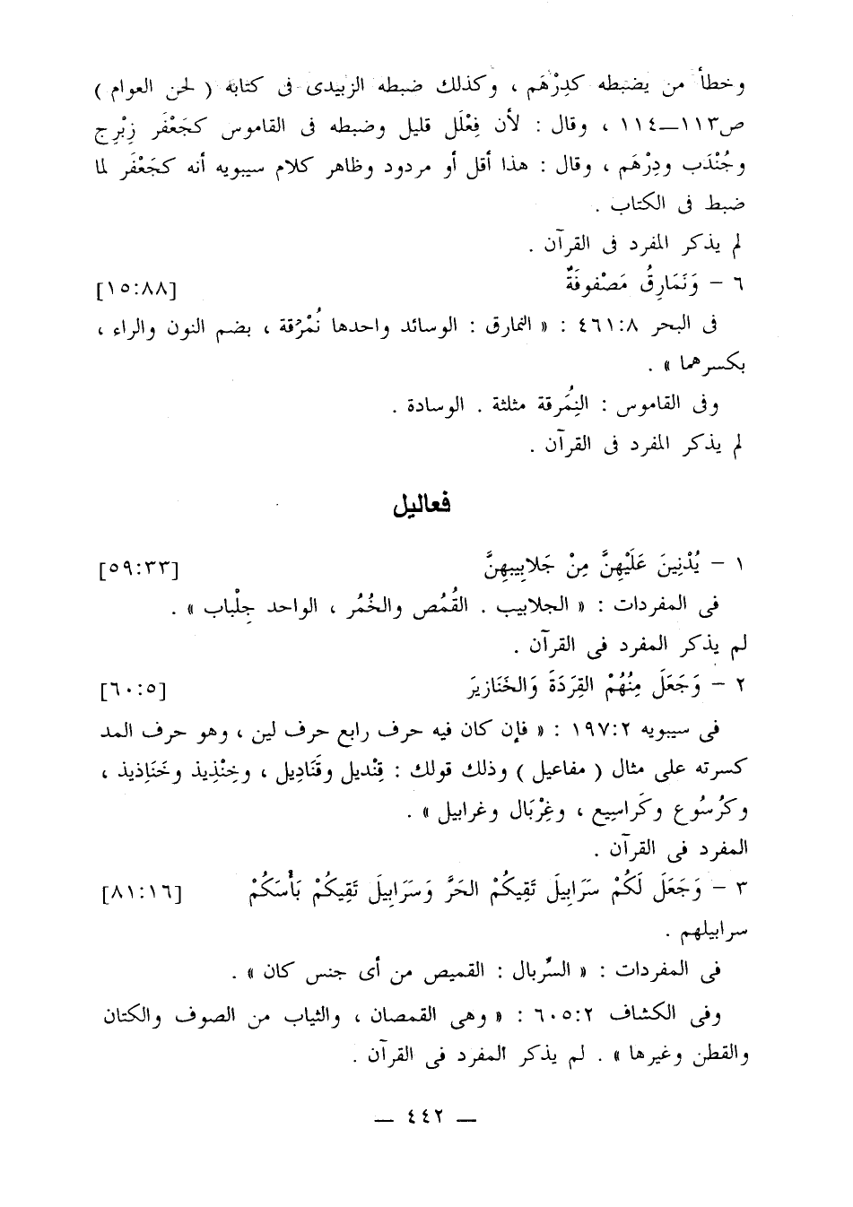في سيبويه 2: 197: «فإن كان فيه حرف رابع حرف لين، وهو حرف المد كسرته على مثال (مفاعيل) وذلك قولك: قنديل وقناديل، وخنذيذ وخناذيذ، وكرسوع وكراسيع، وغربال وغرابيل».