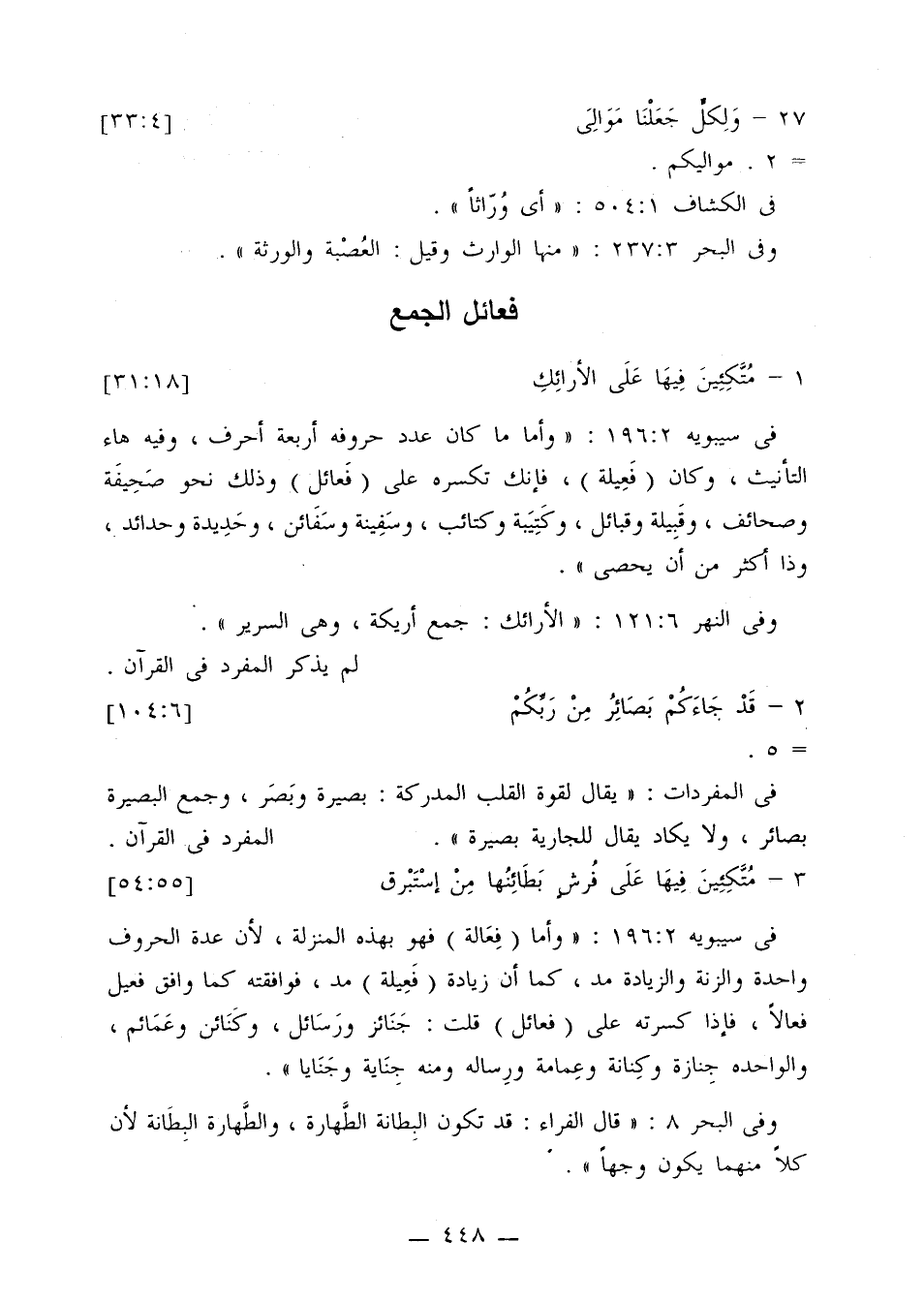 في سيبويه 2: 196: «وأما ما كان عدد حروفه أربعة أحرف، وفيه هاء التأنيث، وكان (فعيلة)، فإنك تكسره على (فعائل) وذلك نحو صحيفة وصحائف، وقبيلة وقبائل، وكتيبة وكتائب، وسفينة وسفائن، وحديدة وحدائد، وذا أكثر من أن يحصى».