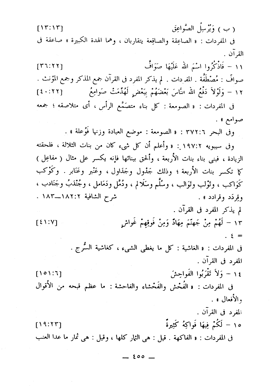 صواف: مصطفة. المفردات. لم يذكر المفرد في القرآن جمع المذكر وجمع المؤنث.