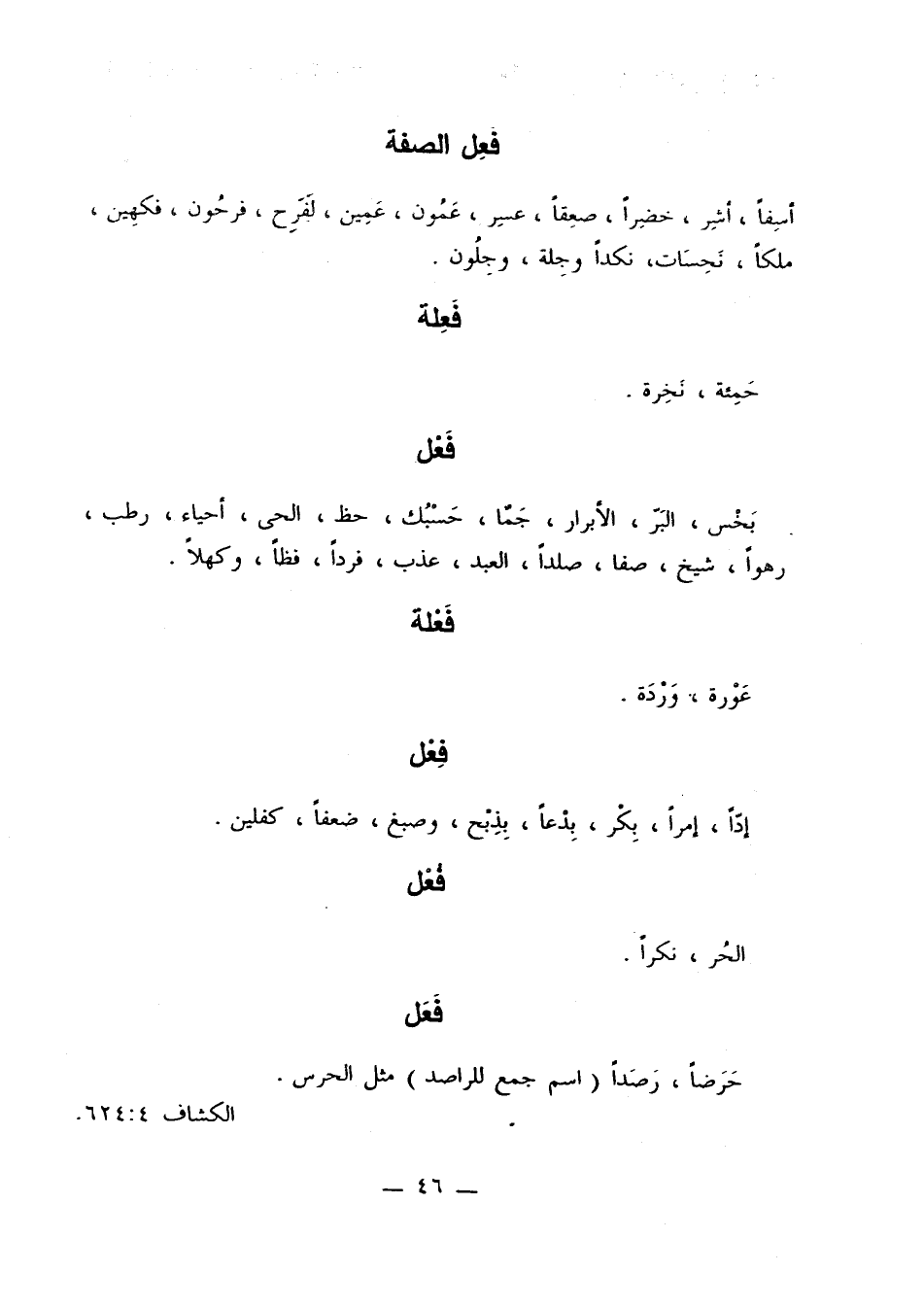 أسفًا، أشر، خضرًا، صعقًا، عسير، عمون، عمين، لفرح، فرحون، فكهين، ملكًا، نحسات، نكدًا وجلة، وجلون.