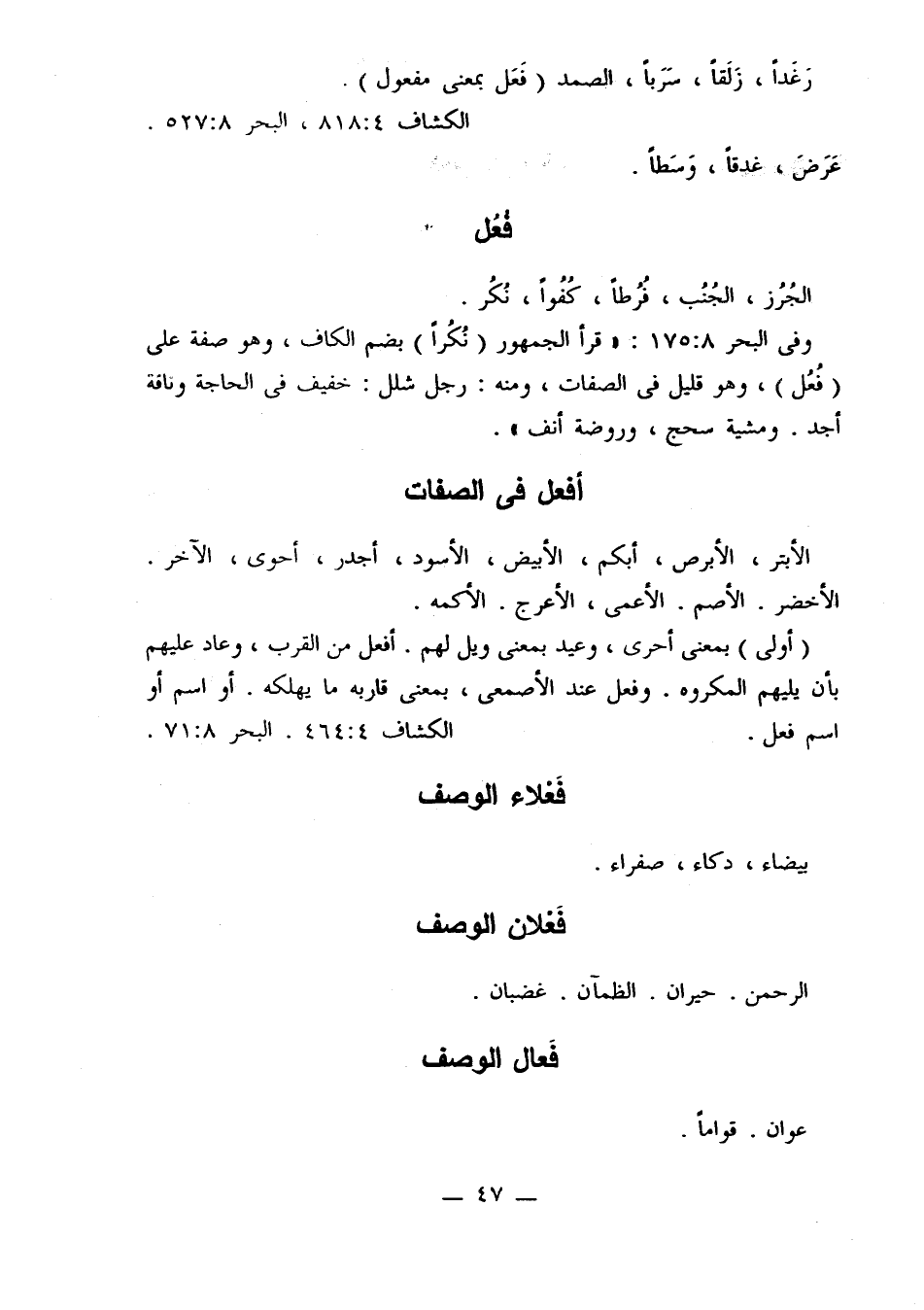 الأبتر، الأرض، أبكم، الأبيض، الأسود، أجدر، أحوى، الآخر. الأخضر. الأصم. الأعمى، الأعرج. الأكمه.