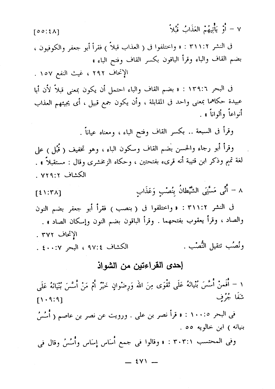 في النشر 2: 311: «واختلفوا في (العذاب قبلا) فقرأ أبو جعفر والكوفيون، بضم القاف والباء وقرأ الباقون بكسر القاف وفتح الباء».