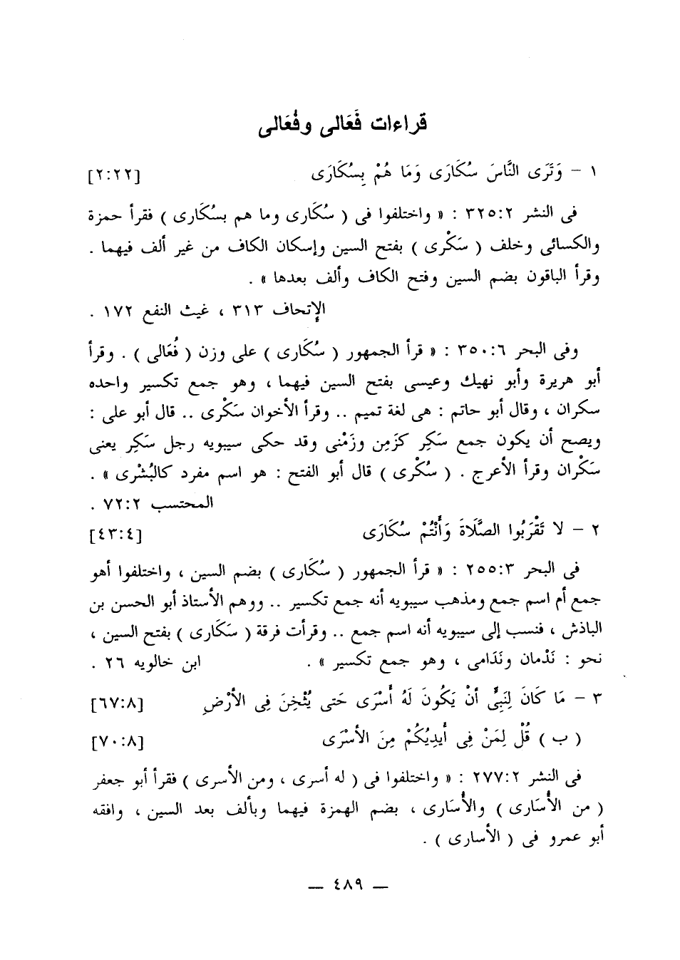 وفي البحر 6: 350: «قرأ الجمهور (سكارى) على وزن (فعالى). وقرأ أبو هريرة وأبو نهيك وعيسى بفتح السين فيهما، وهو جمع تكسير واحده سكران، وقال أبو حاتم: هي لغة تميم ... وقرأ الأخوان سكرى ... قال أبو علي: ويصح أن يكون جمع سكر كزمن وزمنى وقد حكى سيبويه رجل سكر يعني سكران وقرأ الأعرج. (سكرى) قال أبو الفتح: هو اسم مفرد كالبشرى».