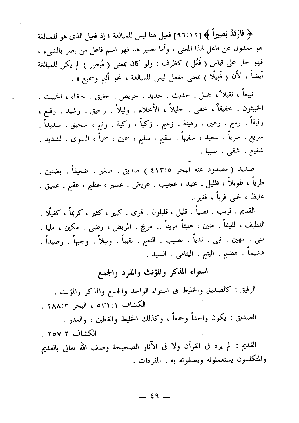 تبيعًا، ثقيلاً، جميل. حديث. حديد. حريص. حقيق. حنقاء، الخبيث. الخبيثون. خفيفًا، خفي. خليلاً، الأخلاء. وليلاً. رحيق. رشيد. رفيع، رفيقًا. رميم. رهين. رهينة. زعيم. زكيًا، زكية. زنيم، سحيق. سديدًا. سريع. سريًا. سعيد، سفيهًا. سقيم، سليم، سمين، سميًا، السوى. لشديد. شفيع. شفى. صبيًا.