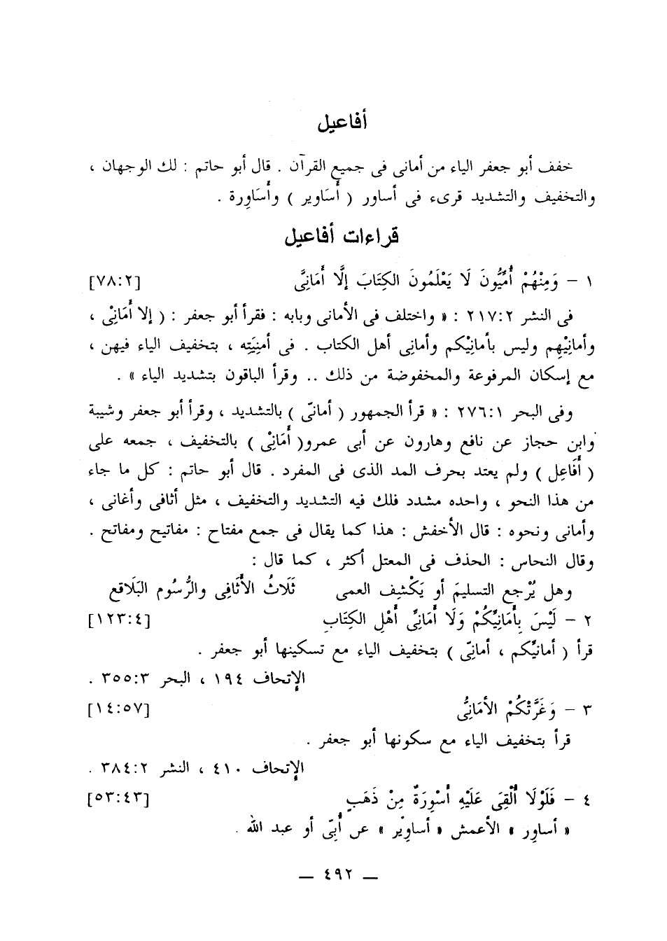 وفي البحر 1: 276: «قرأ الجمهور (أماني) بالتشديد، وقرأ أبو جعفر وشيبة وابن حجاز عن نافع وهارون عن أبي عمرو (أماني) بالتخفيف، جمعه على (أفاعل) ولم يعتد بحرف المد الذي في المفرد. قال أبو حاتم: كل ما جاء من هذا النحو، واحده مشدد فلك فيه التشديد والتخفيف، مثل أثافي وأغاني، وأماني ونحوه: قال الأخفش: هذا كما يقال في جمع مفتاح: مفاتيح ومفاتح. وقال النحاس: الحذف في المعتل أكثر، كما قال: