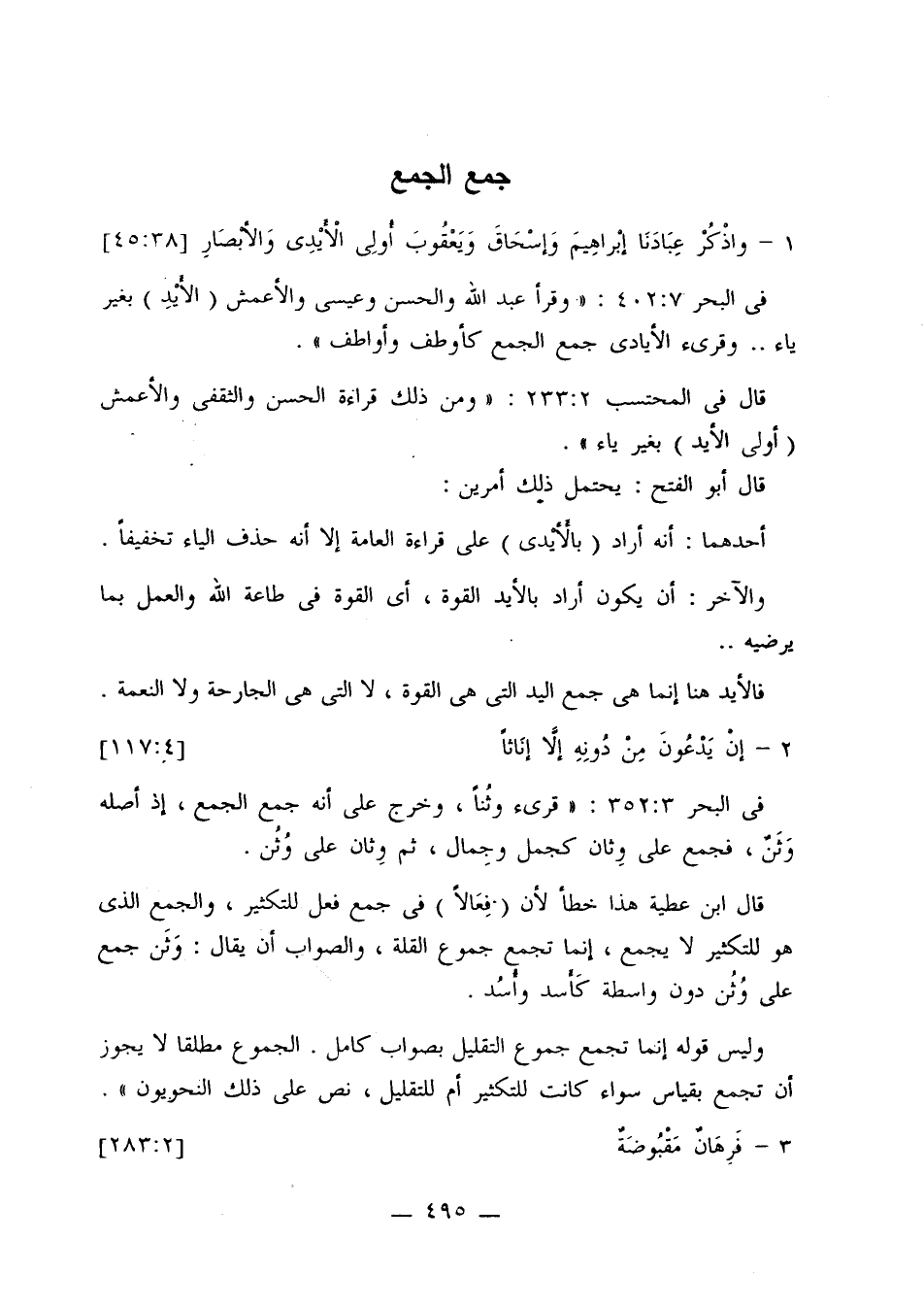 وليس قوله إنما تجمع جموع التقليل بصواب كامل. الجموع مطلقًا لا يجوز أن تجمع بقياس سواء كانت للتكثير أم للتقليل، نص على ذلك النحويون».