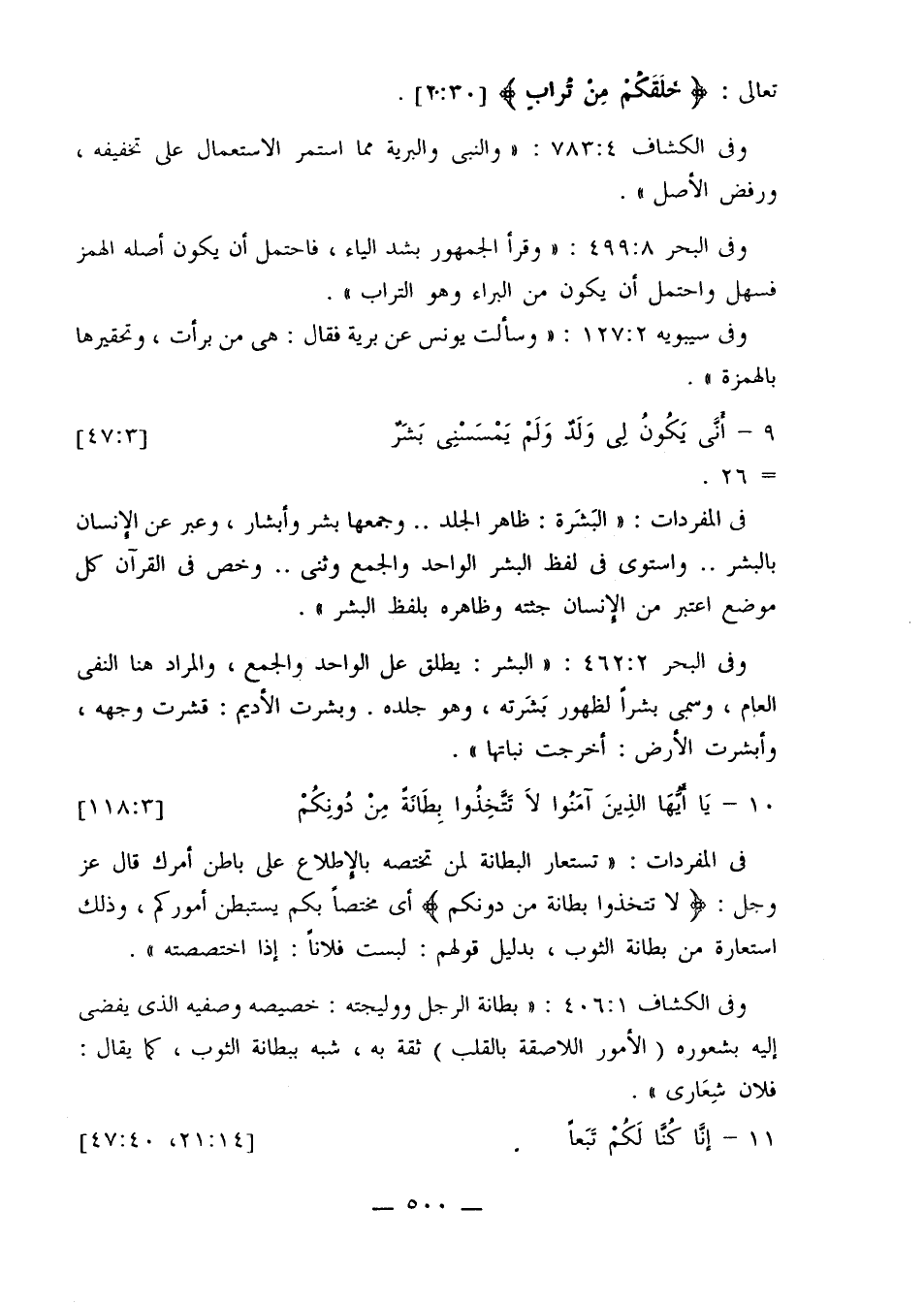 وفي البحر 2: 462: «البشر: يطلق على الواحد والجمع، والمراد هنا النفي العام، وسمي بشرًا لظهور بشرته، وهو جلده. وبشرت الأديم: قشرت وجهه، وأبشرت الأرض: أخرجت نباتها».
