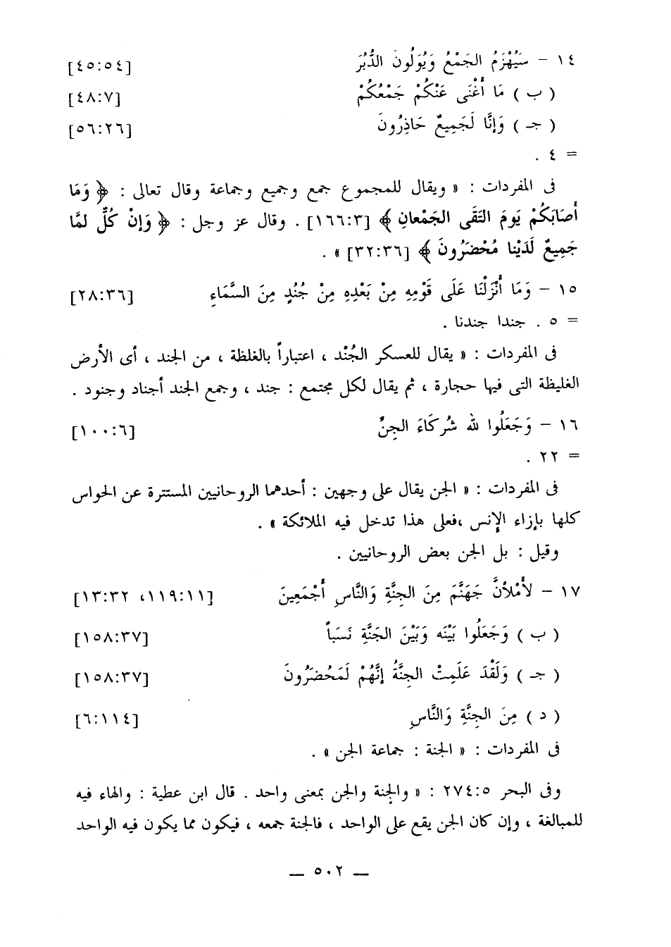 في المفردات: «ويقال للمجموع جمع وجميع وجماعة وقال تعالى: {وما أصابكم يوم التقى الجمعان} [3: 166]. وقال عز وجل: {وإن كل لما جميع لدينا محضرون} [36: 32]».