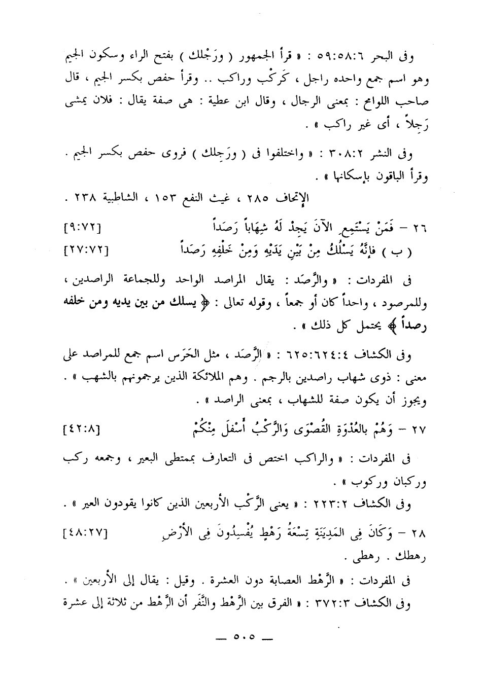 وفي الكشاف 4: 624: 625: «الرصد، مثل الحرس اسم جمع للمراصد على معنى: ذوي شهاب راصدين بالرجم. وهم الملائكة الذين يرجمونهم بالشهب».