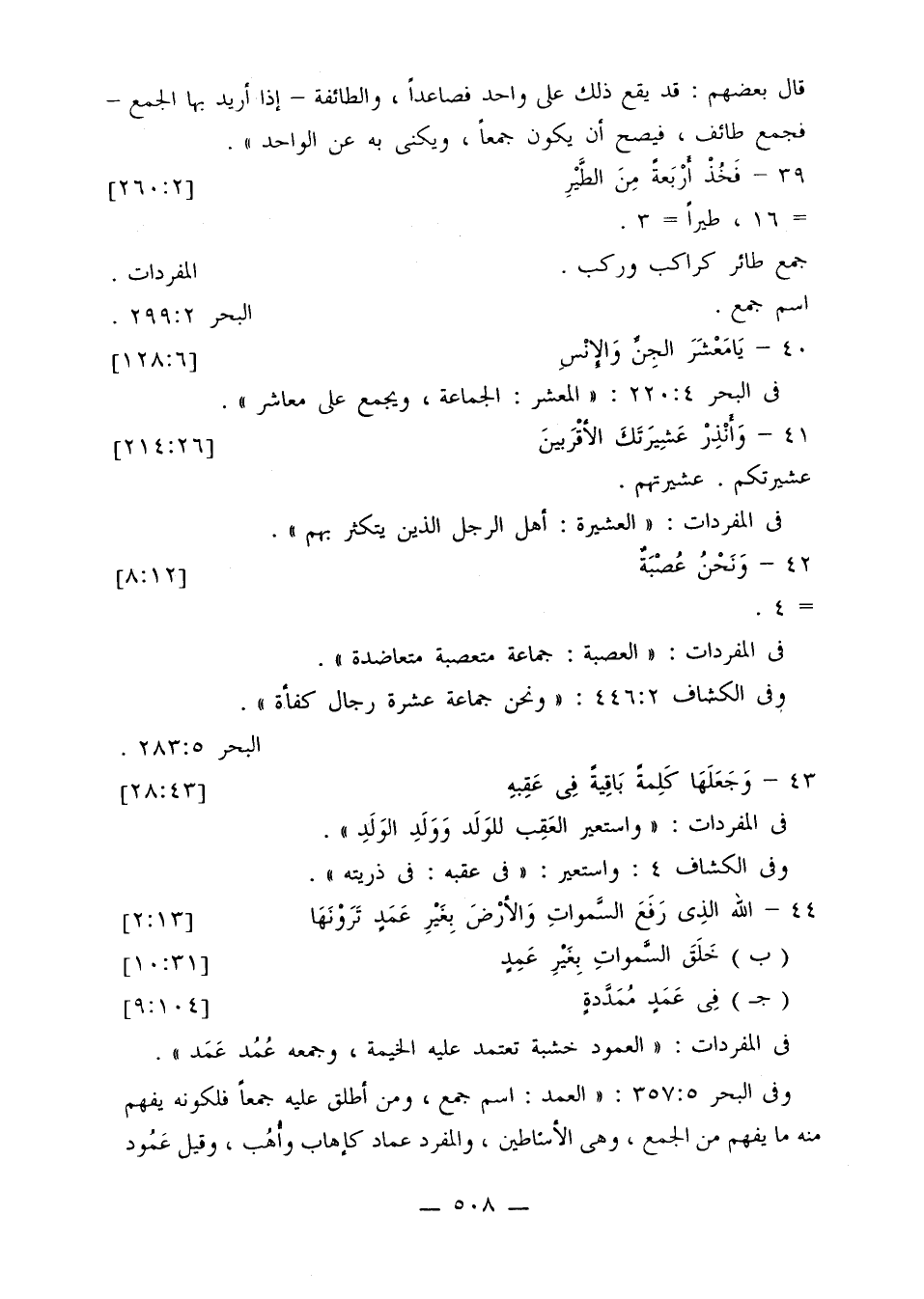 وفي البحر 5: 357: «العمد: اسم جمع، ومن أطلق عليه جمعًا فلكونه يفهم منه ما يفهم من الجمع، وهي الأساطين، والمفرد عماد كإهاب وأهب، وقيل عمود