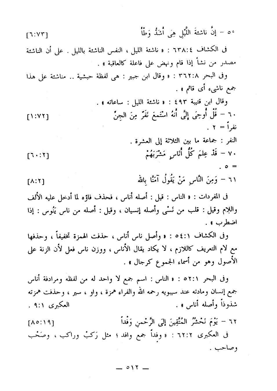 في الكشاف 4: 638: «ناشئة الليل، النفس الناشئة بالليل. على أن الناشئة مصدر من نشأ إذا قام ونهض على فاعلة كالعاقبة».