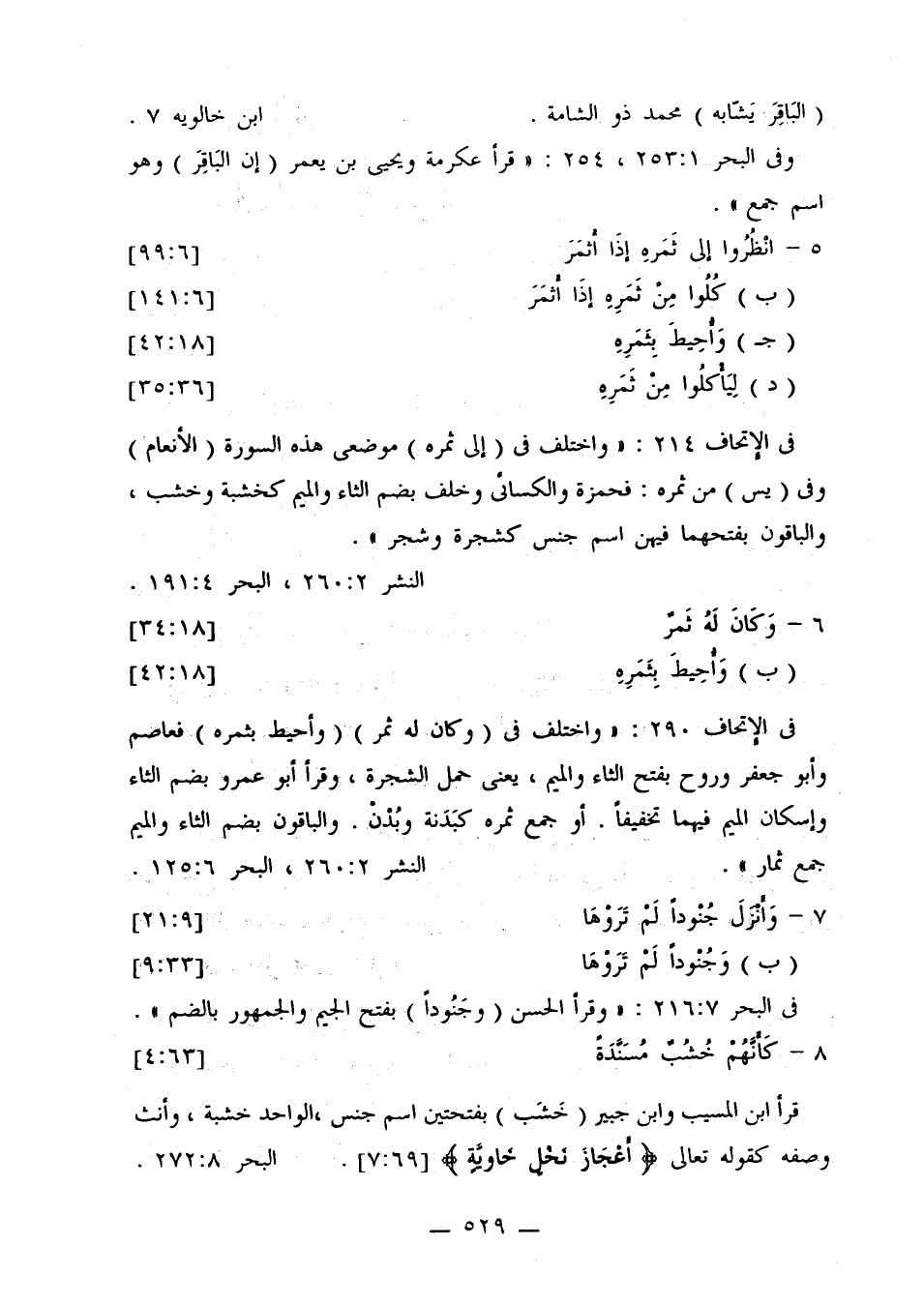 في الإتحاف 290: «واختلف في (وكان له ثمر) (وأحيط بثمره) فعاصم وأبو جعفر وروح بفتح الثاء والميم، يعني حمل الشجرة، وقرأ أبو عمرو بضم الثاء وإسكان الميم فيهما تخفيفًا. أو جمع ثمره كبدنة وبدن. والباقون بضم الثاء والميم جمع ثمار». النشر 2: 260، البحر 6: 125.